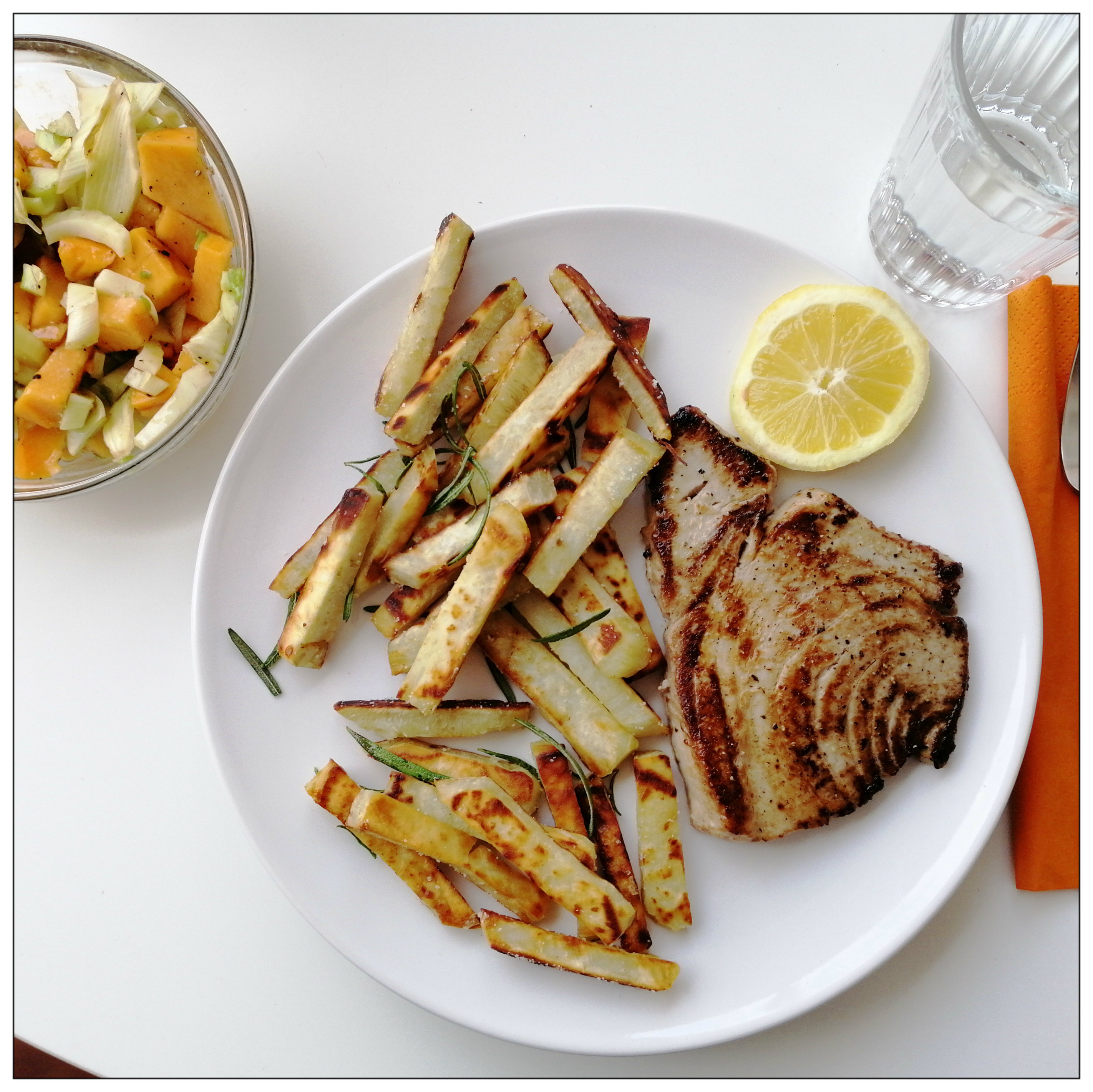 1 kleine weiße Süßkartoffel (ca. 300 g) (ersatzweise eine orange) schälen und in etwas Streifen von ca. 1 cm Dicke schneiden, die Nadeln von