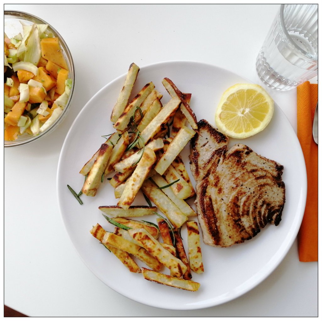 1 Tunfischsteak (ca. 200 g) in einer Pfanne in