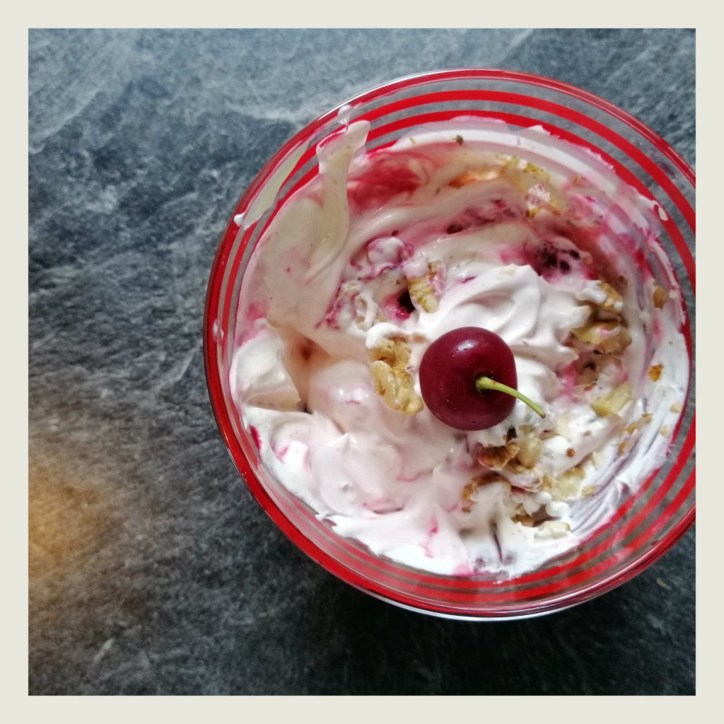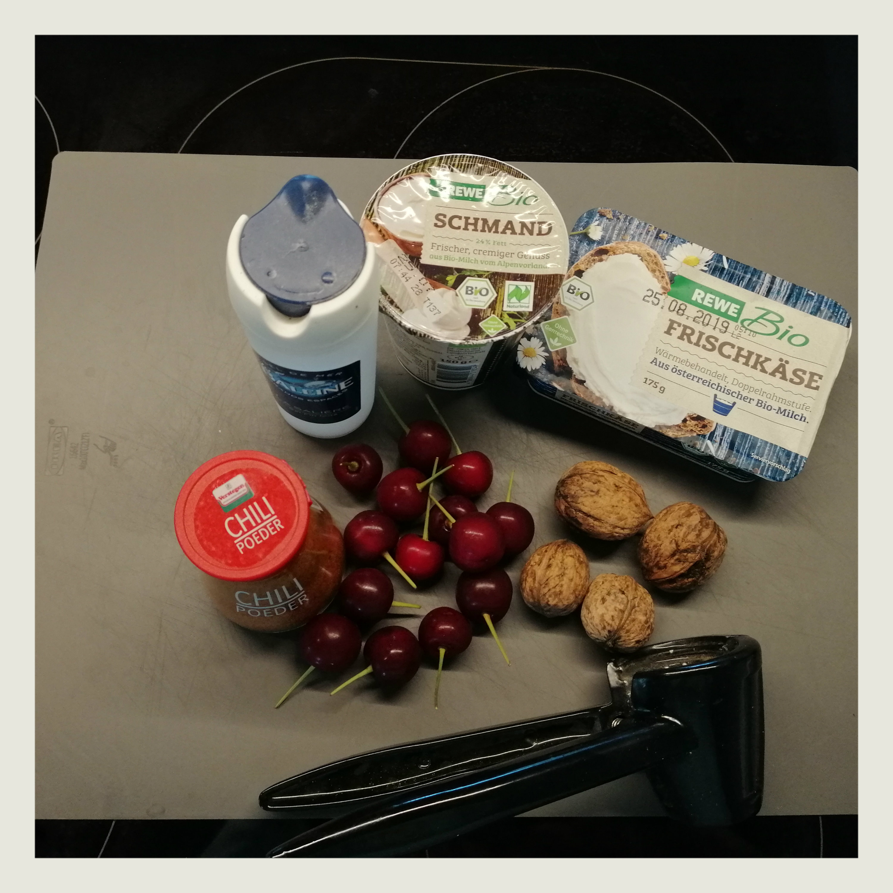 1/3 TL Chilipulver verrühren, Sauerkirschen und Walnüsse unterrühren und mit