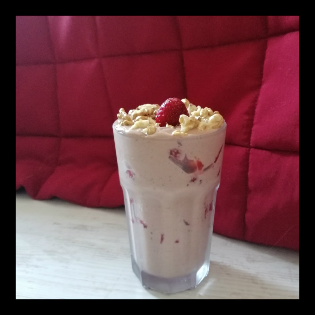 150 g Erdbeeren vierteln, dabei eine schöne übriglassen, dann die Erdbeeren abwechselnd mit dem Schokojoghurt in ein hohes großes Glas geben und mit