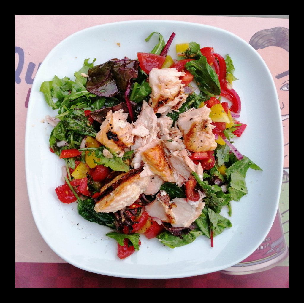das Lachs wenden und etwa weitere 4 Min. grillen, dann den Lacht in größeren Stücken auf den Salat geben und mit
