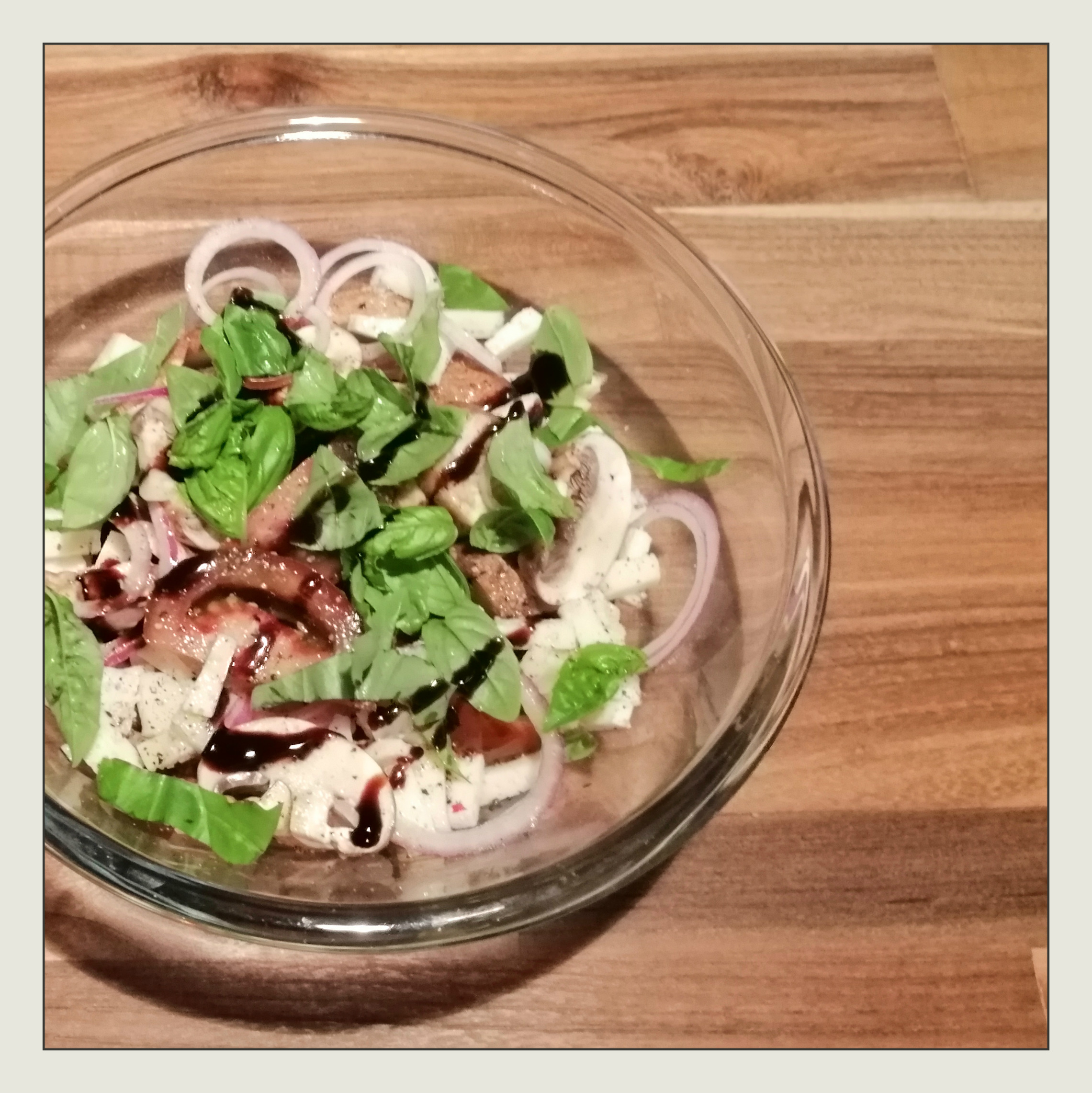 40 g halbfesten Ziegenkäse in kleine kurze Streifen schneiden, alles in einer Schüssel miteinander vermischen, mit