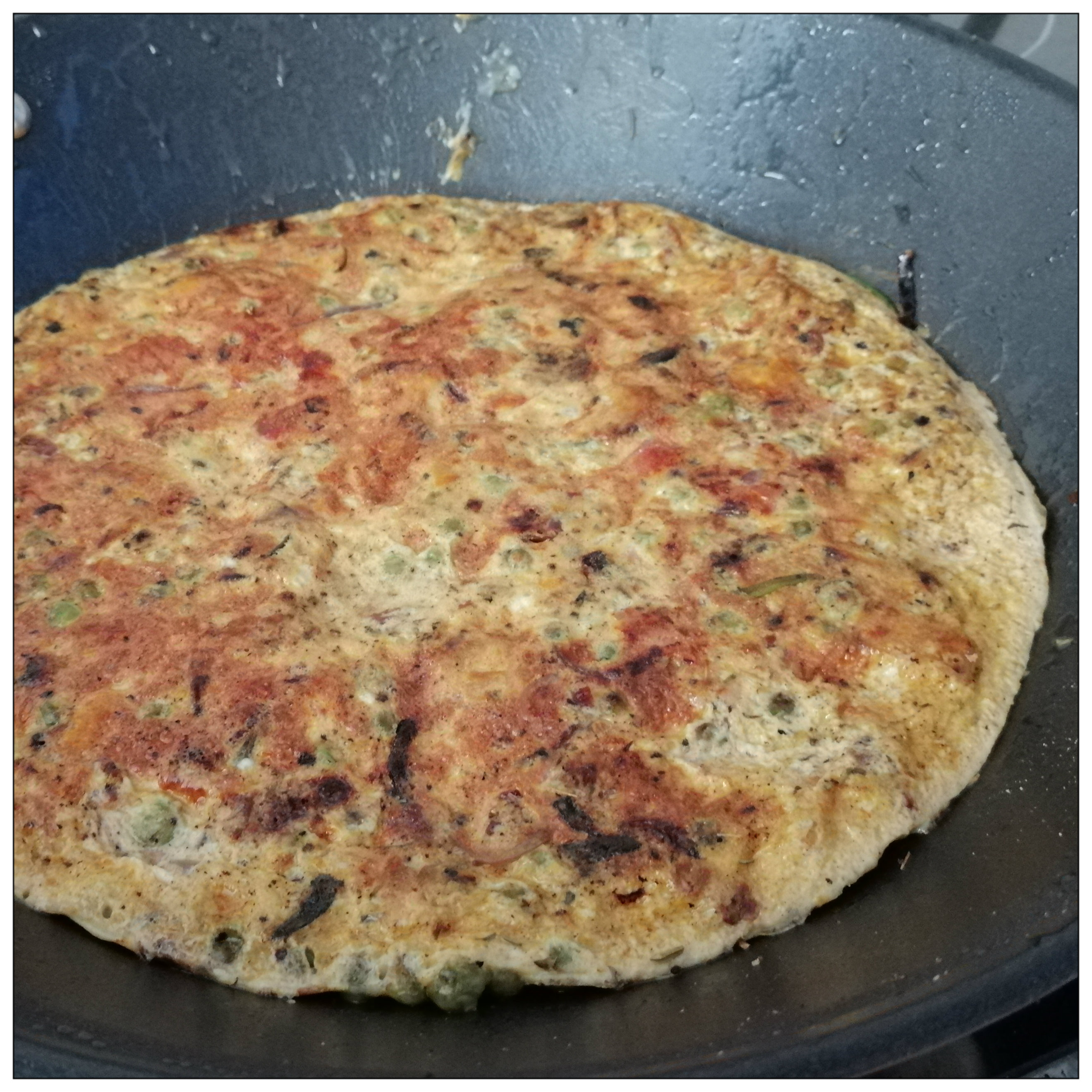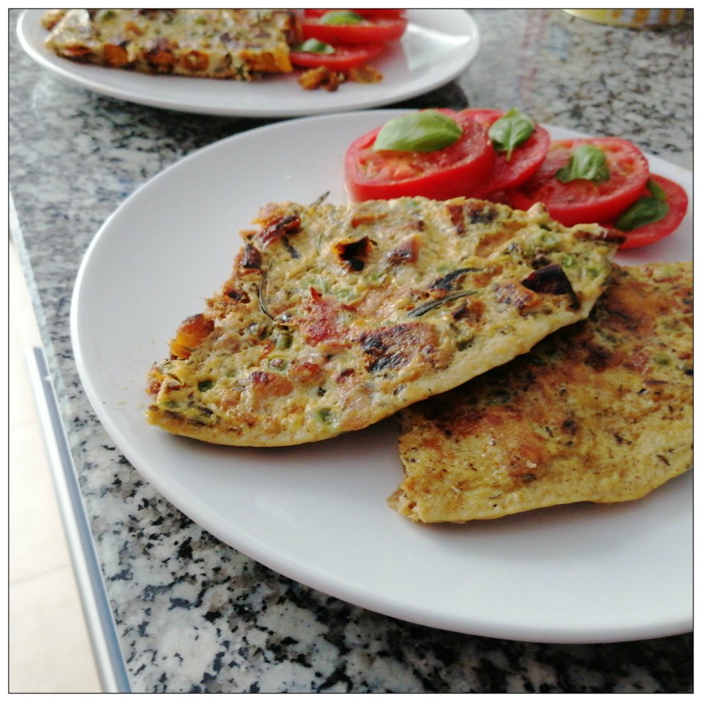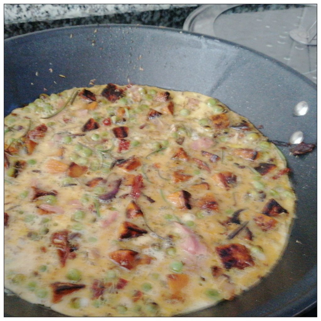 1 EL Brat-Olivenöl in der Pfanne mittelstark erhitzen, die Ei-Mischung hineingießen und die Pfanne sofort mit dem Deckel schließen, nach ca. 4 Min. die Hitze auf mittelschwach reduzieren, noch weitere ca. 8 Min. garen bis auch die Oberfläche nicht mehr flüssig ist, dann die Tortilla über den Deckel wenden und noch ca. 3 Min. von der anderen Seite braten