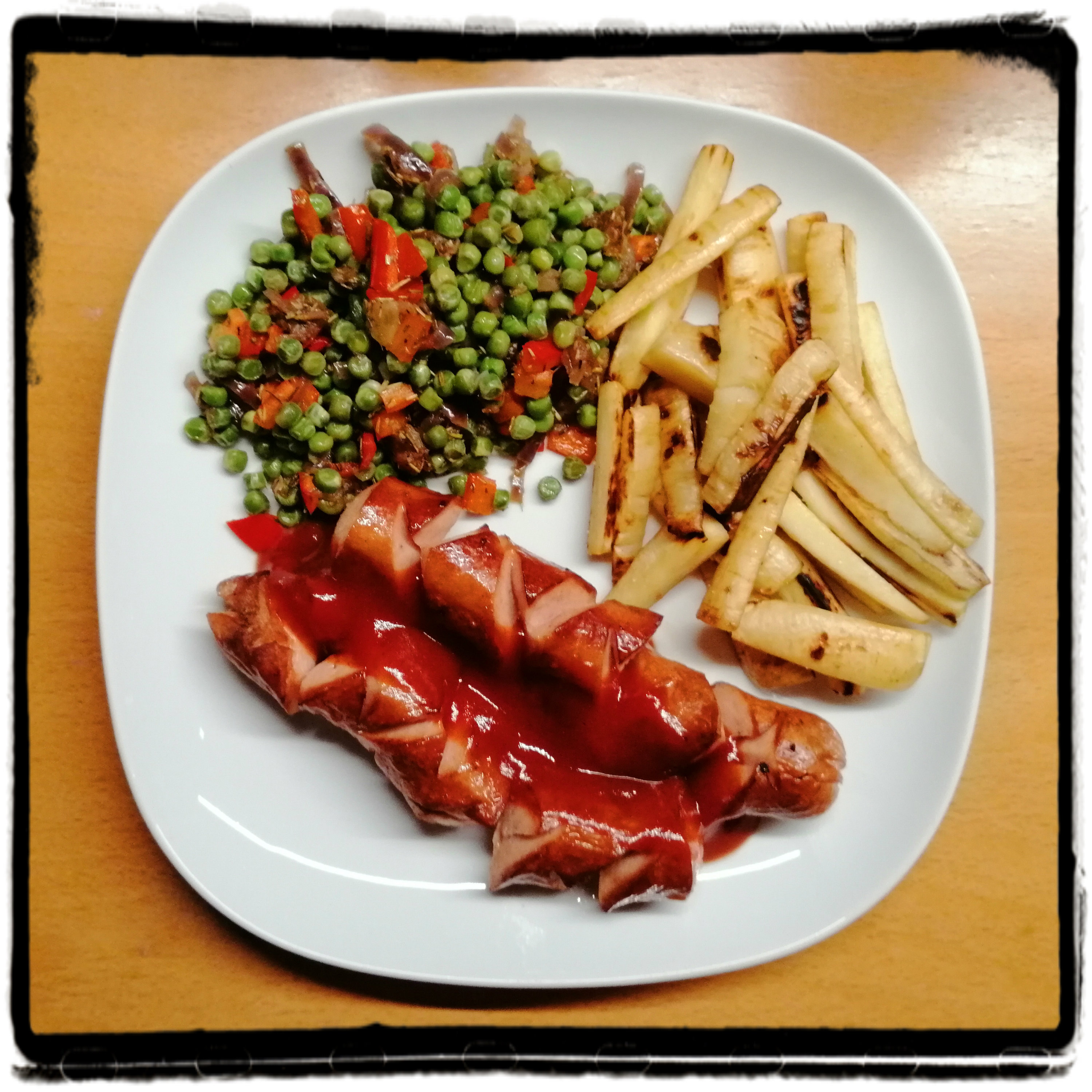 die Currywürste mit dem Gemüse, den Pastinaken und