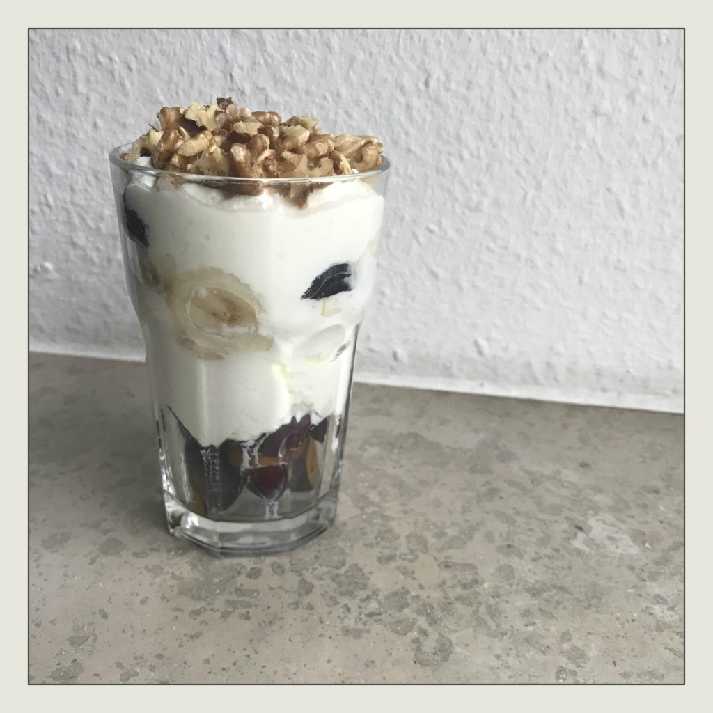 1/2 Banane (in Scheiben geschnitten) im Wechsel in ein großes weites Glas schichten und mit