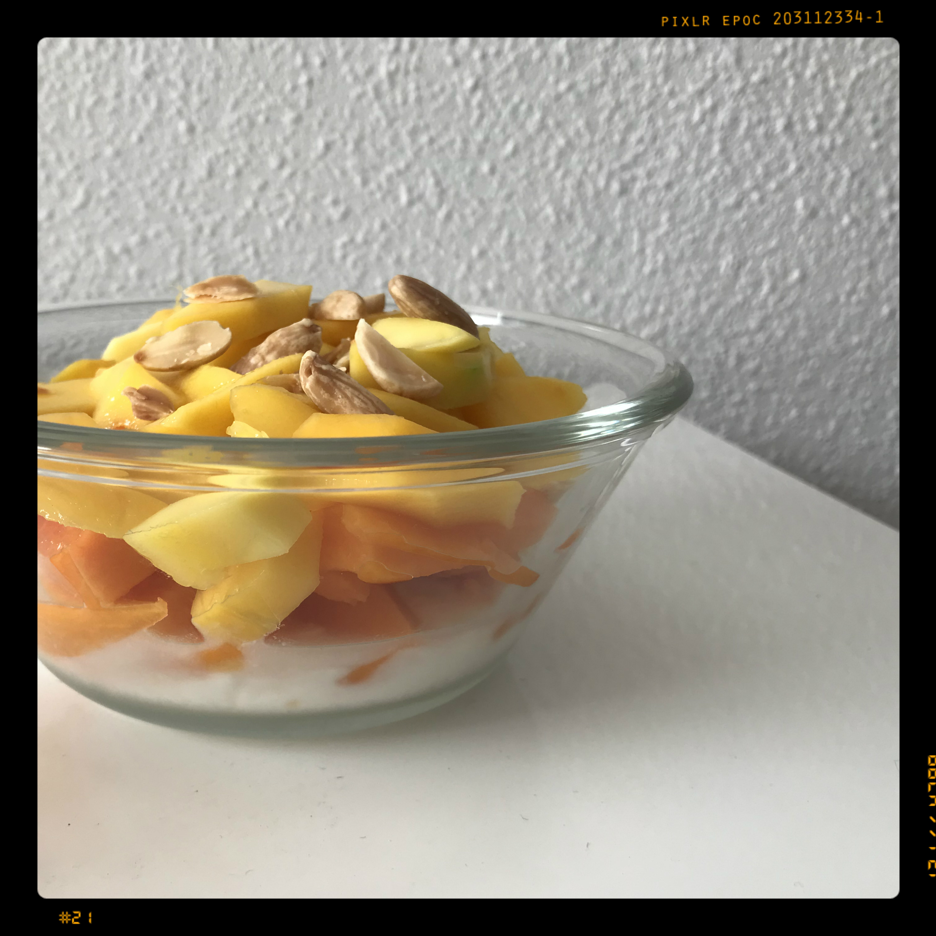 1/3 Mango in kleine Stücke schneiden und auf den Joghurt geben, dann mit