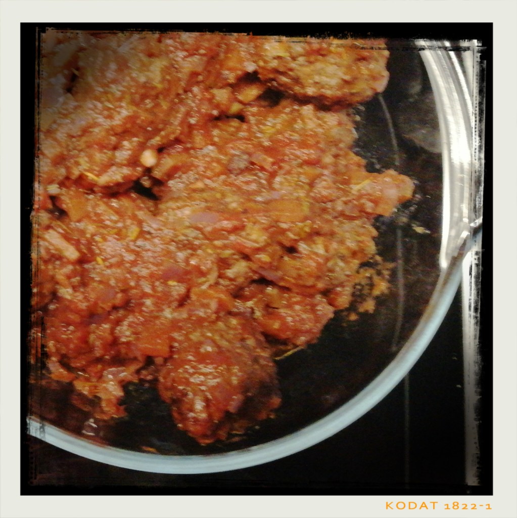 1/2 Dose gehackte Tomaten (200 g) zugeben und alles bei schwacher bis mittlerer Hitze noch 5 – 10 Min. köcheln lassen,