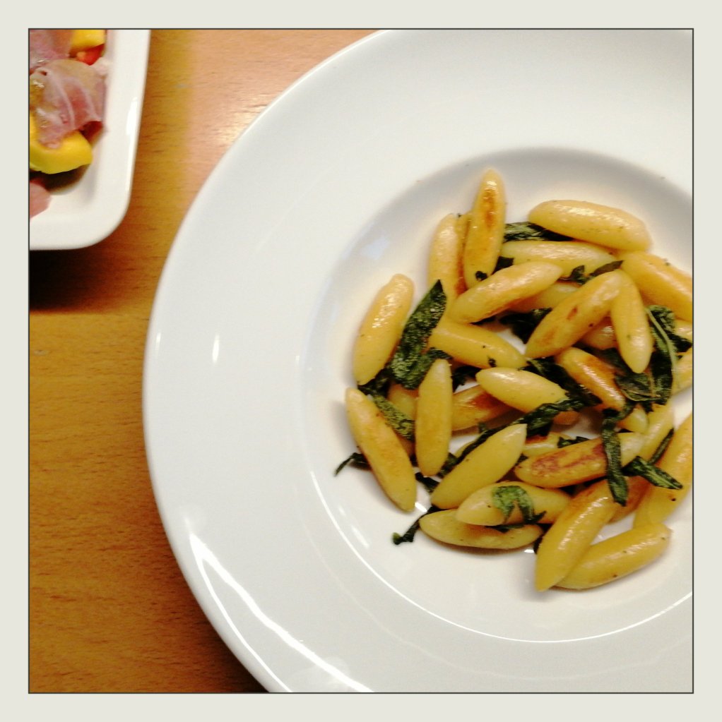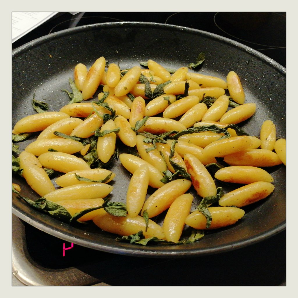 1 Bund Salbei abzupfen, die Salbeiblätter zu den Schupfnudeln geben und noch weitere 3 – 5 Min. braten, bis auch die Salbeiblätter leicht gebräunt sind, mit