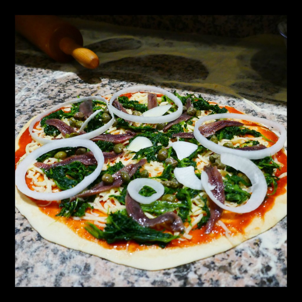 etwas Hartweizengrieß wenden und gleichmäßig dünn ausrollen, dabei ab und zu mit den Händen in Form ziehen, mit der Tomatensauce bestreichen, den Gouda darauf verteilen, dann mit dem gut ausgedrückten Spinat,