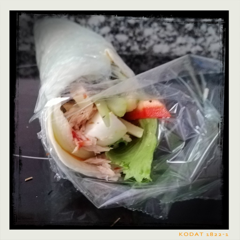 Frischhaltefolie (oder wenn man ihn sofort isst: Pergamentpapier) wickeln
