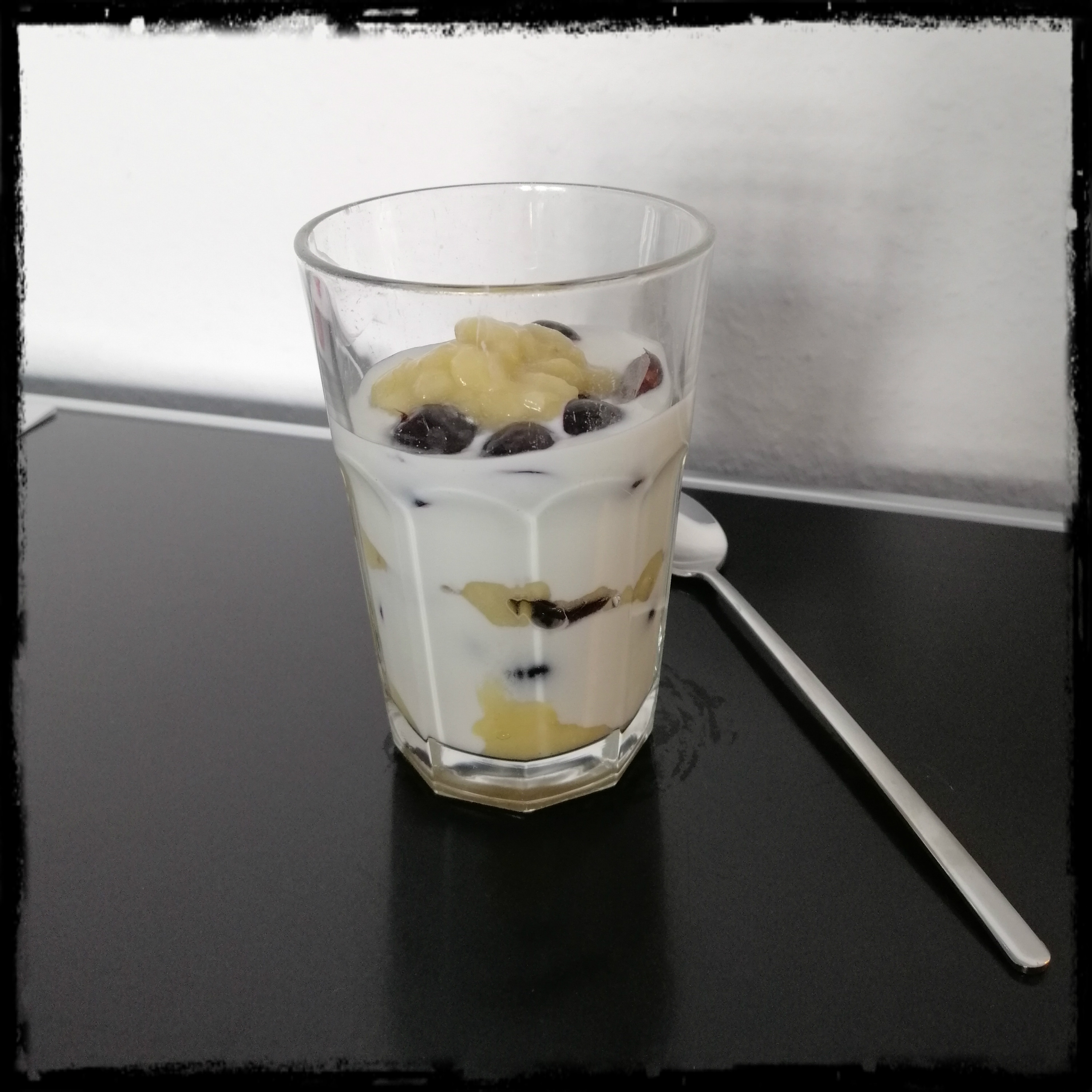 150 g Ziegenjoghurt und die Weinbeeren abwechseln in ein weites hohes Glas schichten