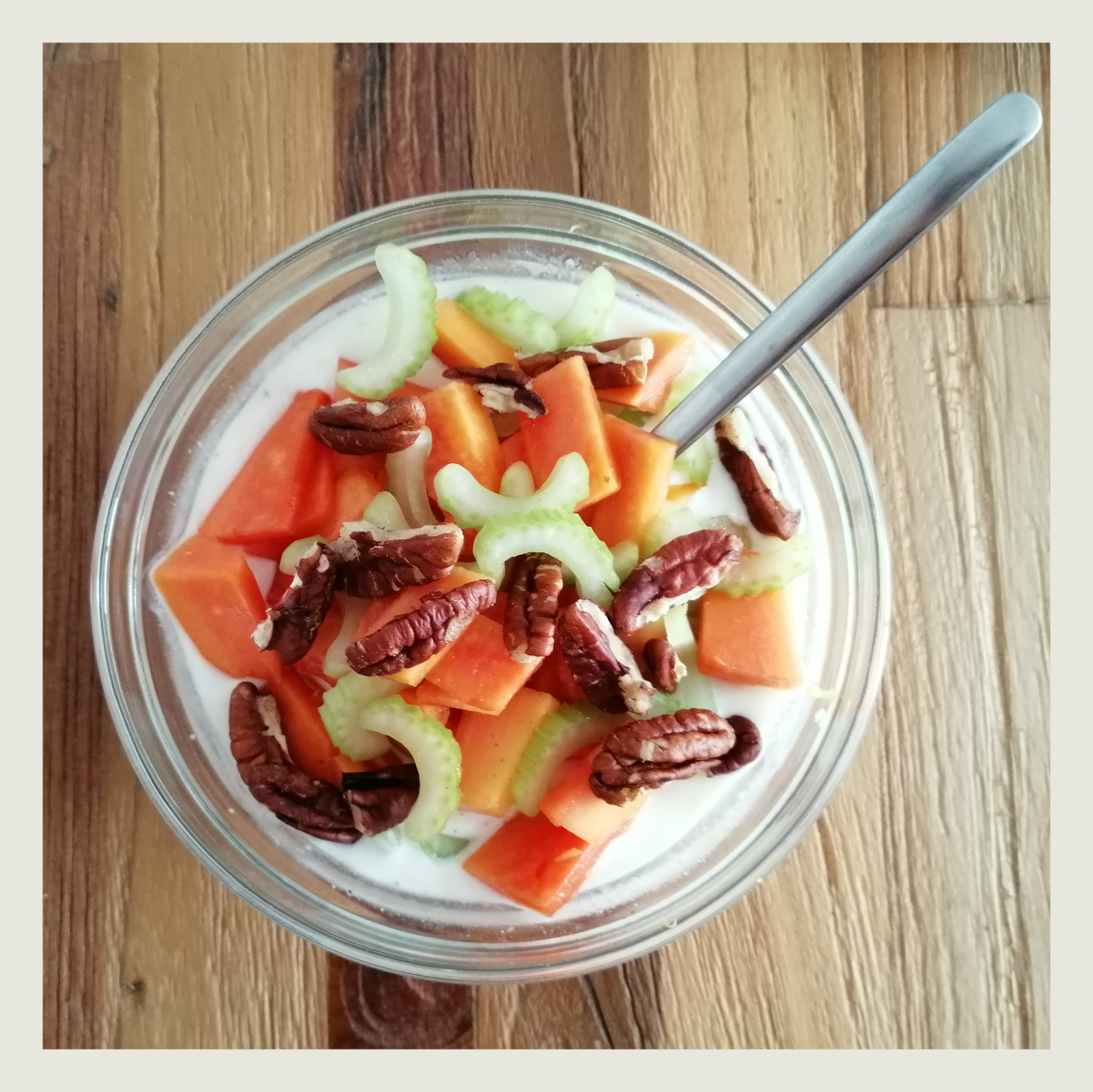 1 dicke Scheibe Papaya (ca. 140 g – in kleine Stücke geschnitten) darauf geben, dann mit