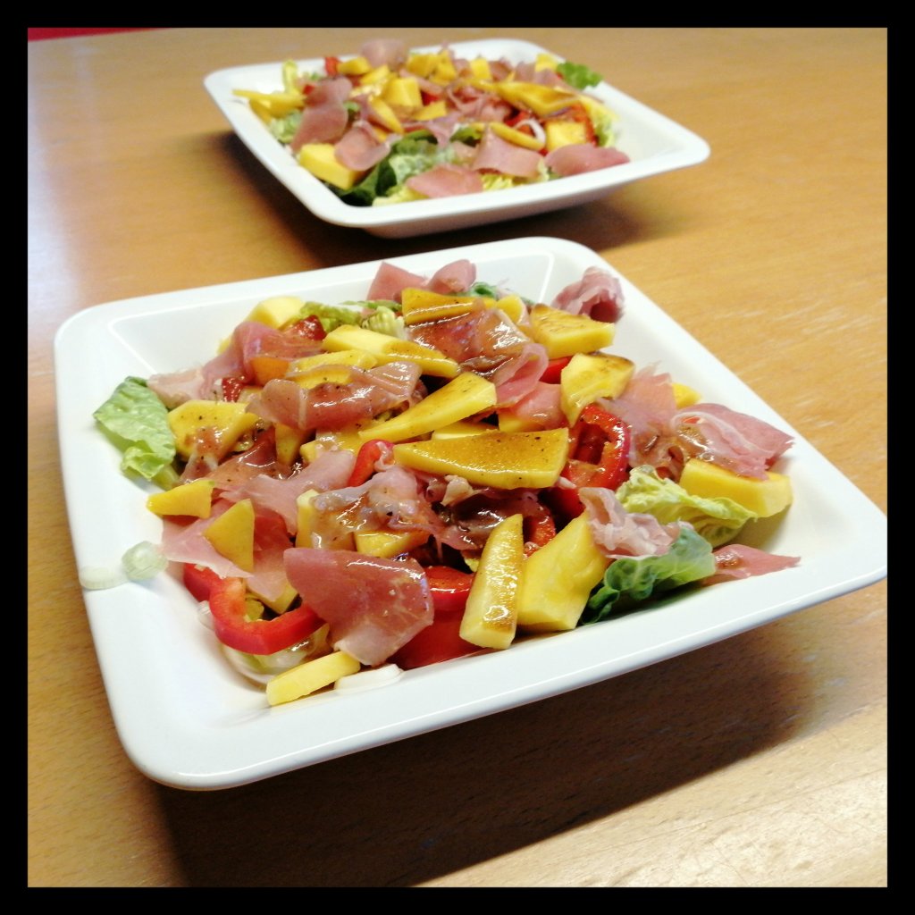 1/2 Mango in breitere kurze Streifen scheiden, alles auf den Salatblättern verteilen und mit einem Dressing aus