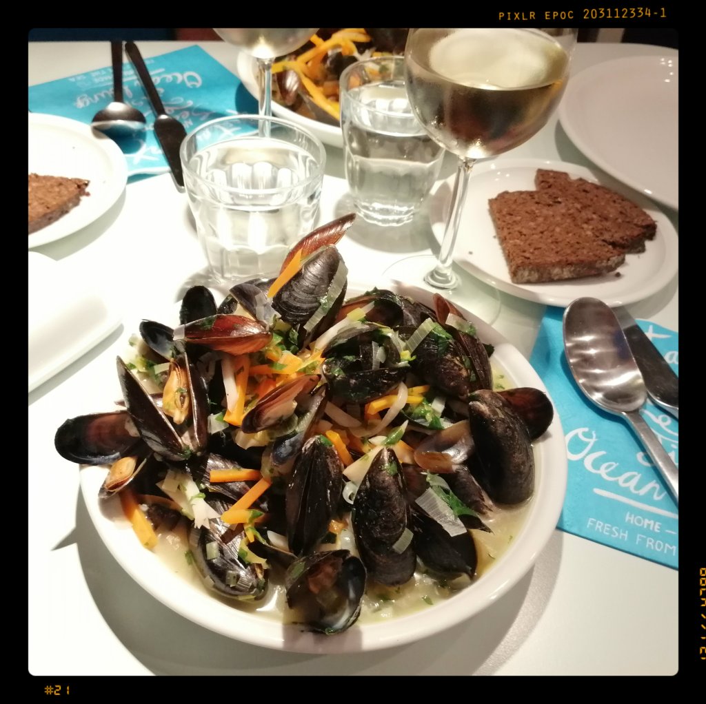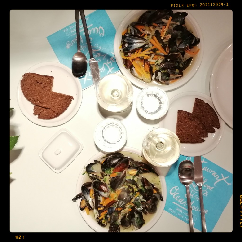 die Muscheln sollten nun geöffnet sein, die Petersilie untermischen und Muscheln mit Gemüse und Brühe auf zwei große tiefe Teller verteilen (bei kleineren Tellern eben später nachnehmen), dazu
