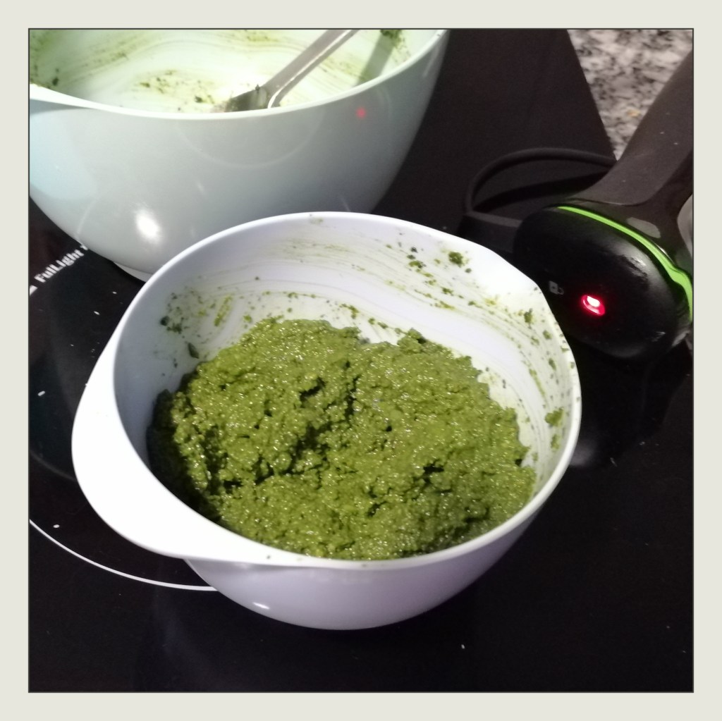 60 g Basilikumblätter im Mixer gut zerkleinern,
