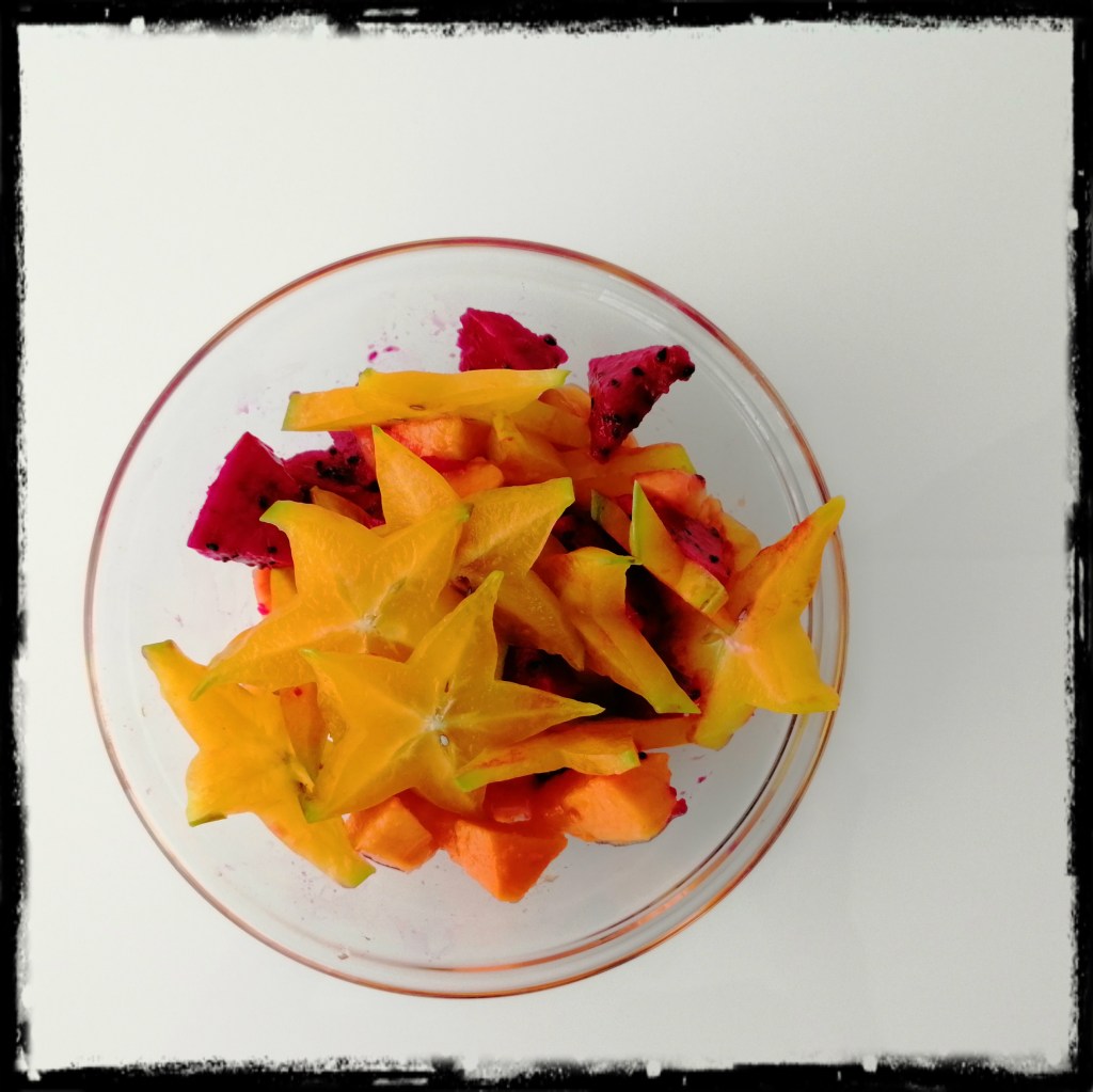 1 Sternfrucht (ca. 100 g) in Scheiben schneiden und alles zu einem Salat vermischen