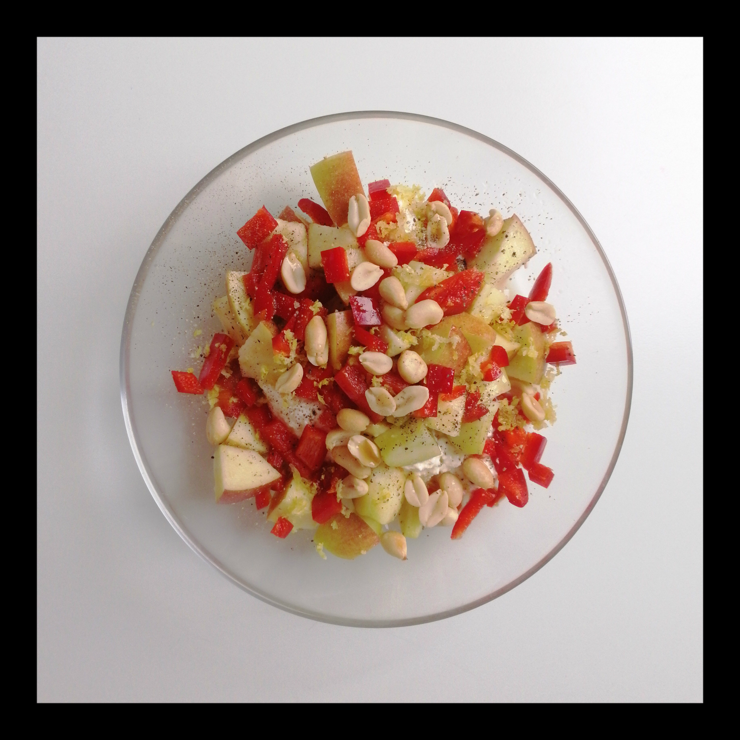1 Scheibe Papaya (ca. 100 g) in kleine Stücke schneiden, alles auf zwei Tellern verteilen und mit einem Dressing aus