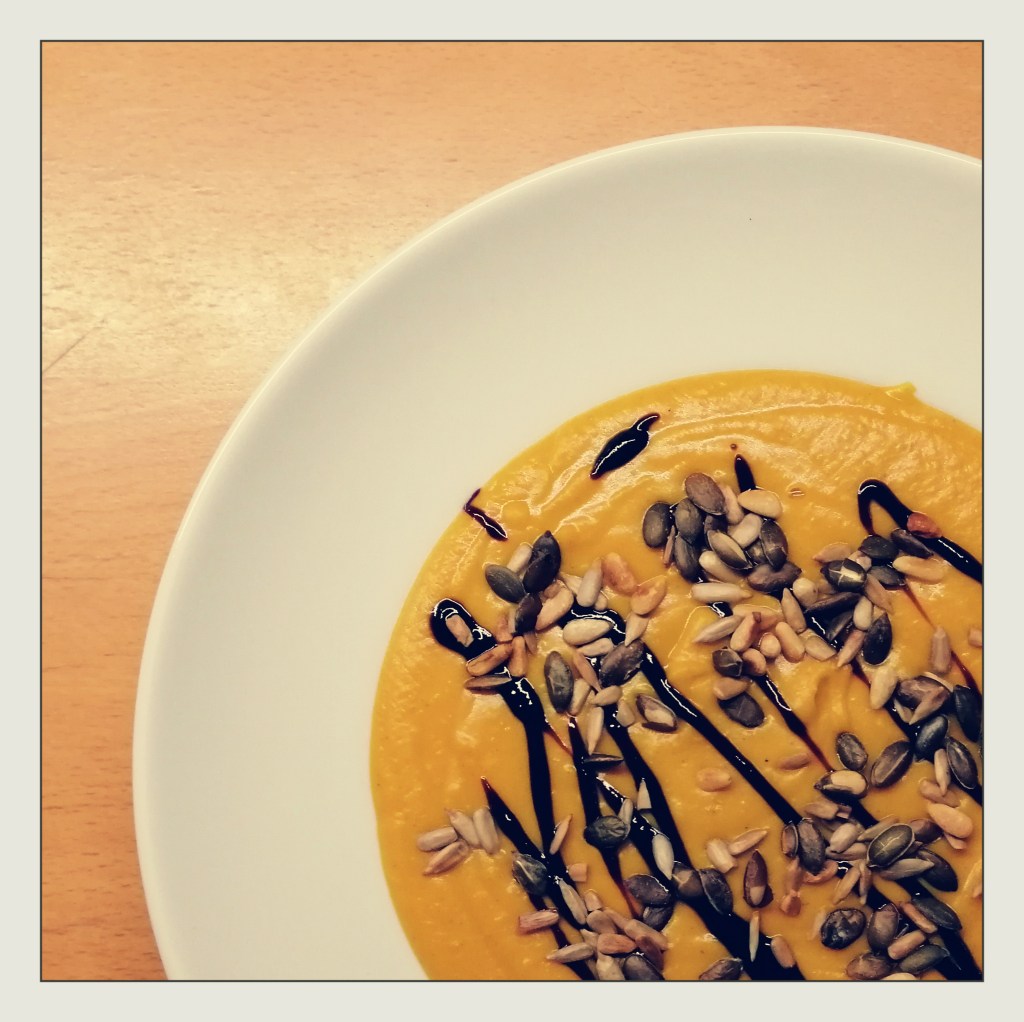 einige Spritzer Balsamico Crema darauf verteilen und die Kerne darüberstreuen