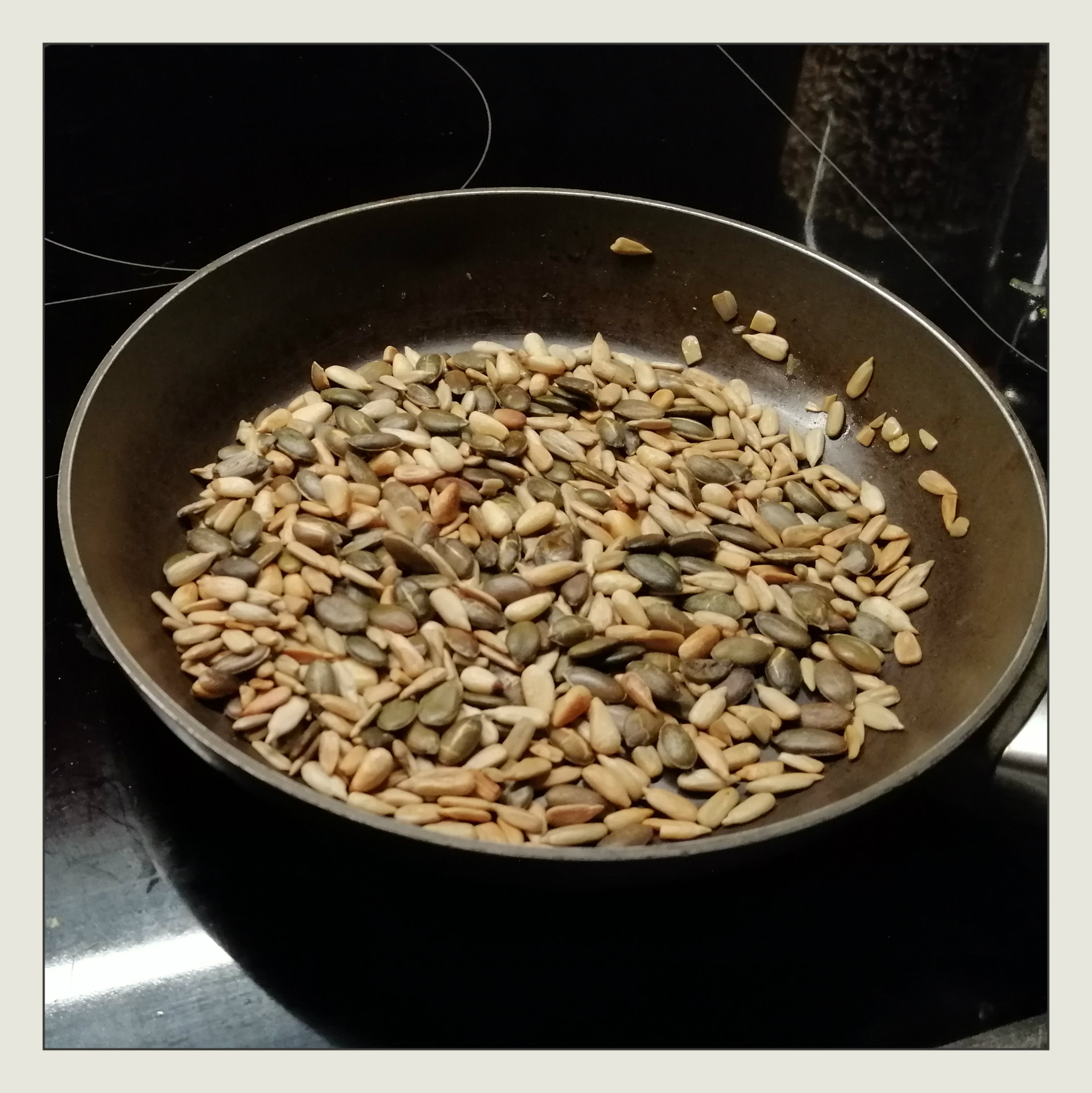 100 g gem. Salatkerne (inkl. oder auch nur Kürbiskerne) in einer Pfanne anrösten und abkühlen lassen