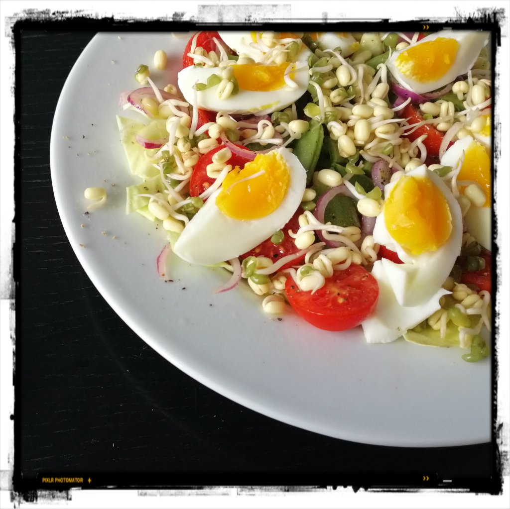 30 g Mungbohnenkeime und die geviertelten Eier darauf verteilen