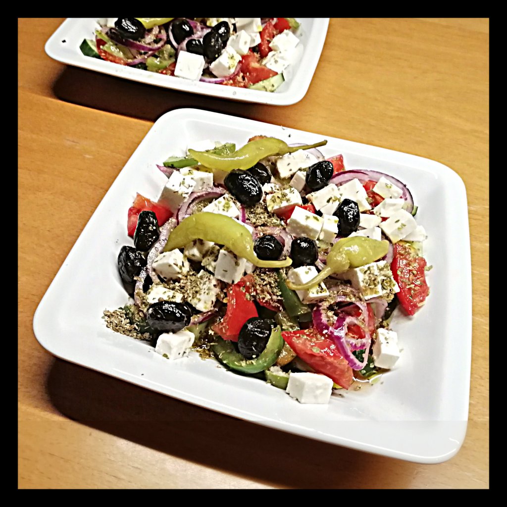 6 kl. eingelegten milden Peperoni auf den Salaten verteilen, mit