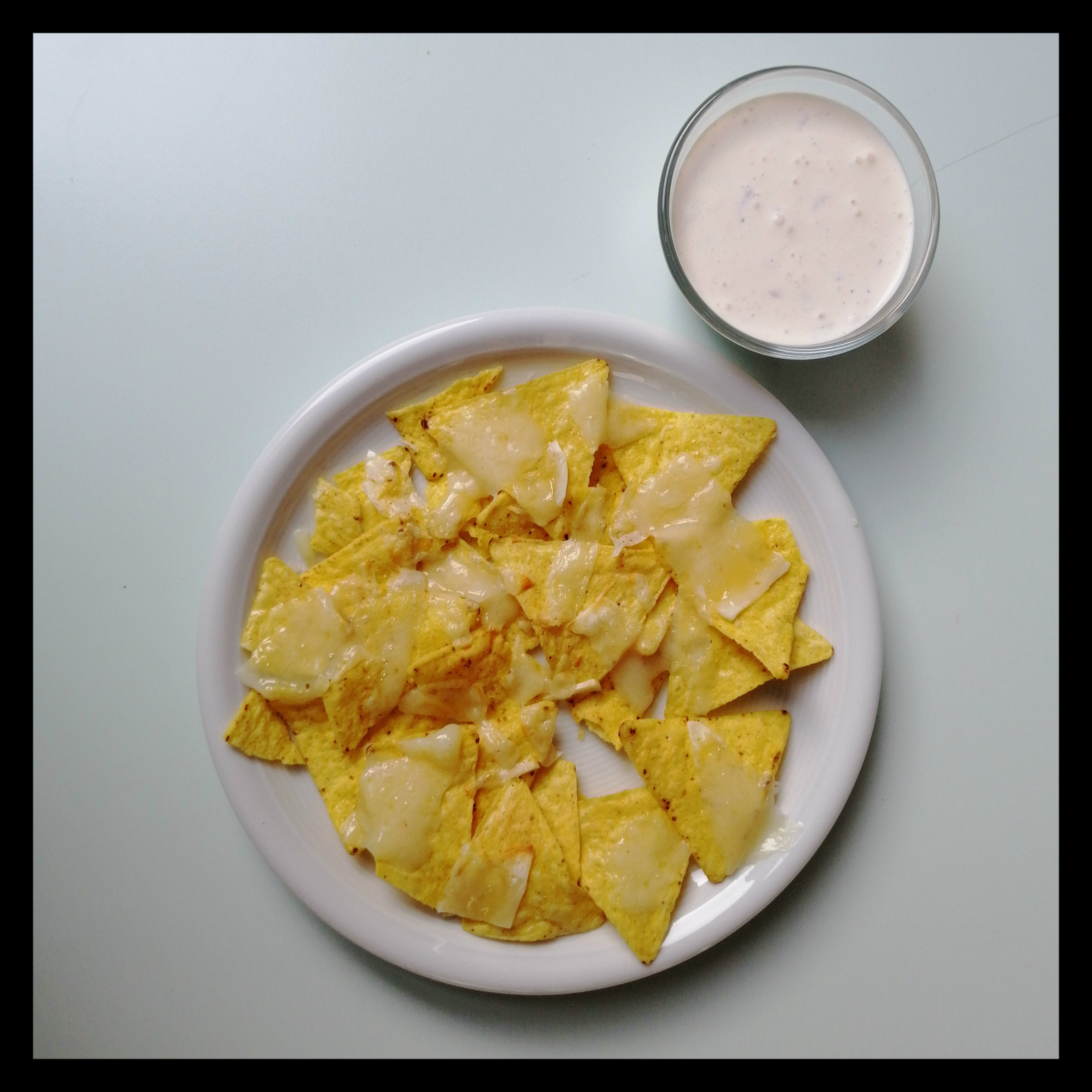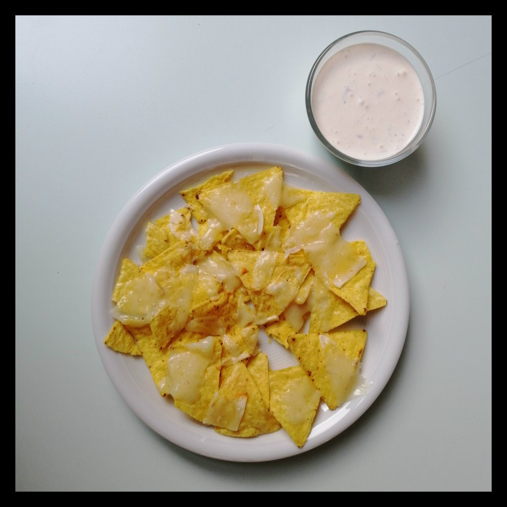 die Nachos auf eine Platte oder zwei Teller geben und mit dem servieren, alternativ passt natürlich statt dem Sauerrahm-Dip auch Guacamole (siehe Rezept vom 1. November 2017)