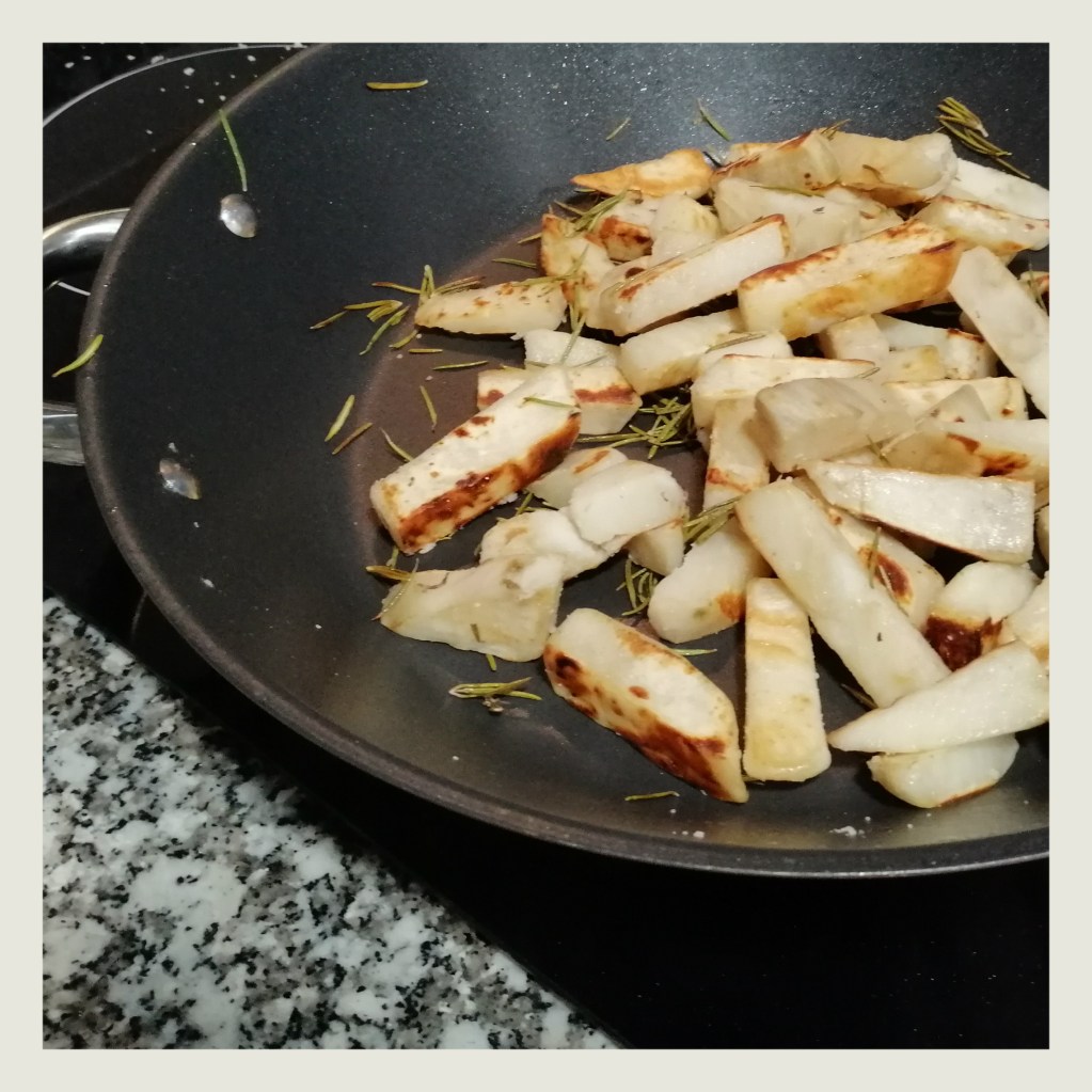 1 Batate rojo von Lanzarote (ca. 600 g – ersatzweise Süßkartoffeln) in etwas längere Stücke von ca. 1 cm Dicke schneiden, die Nadeln von