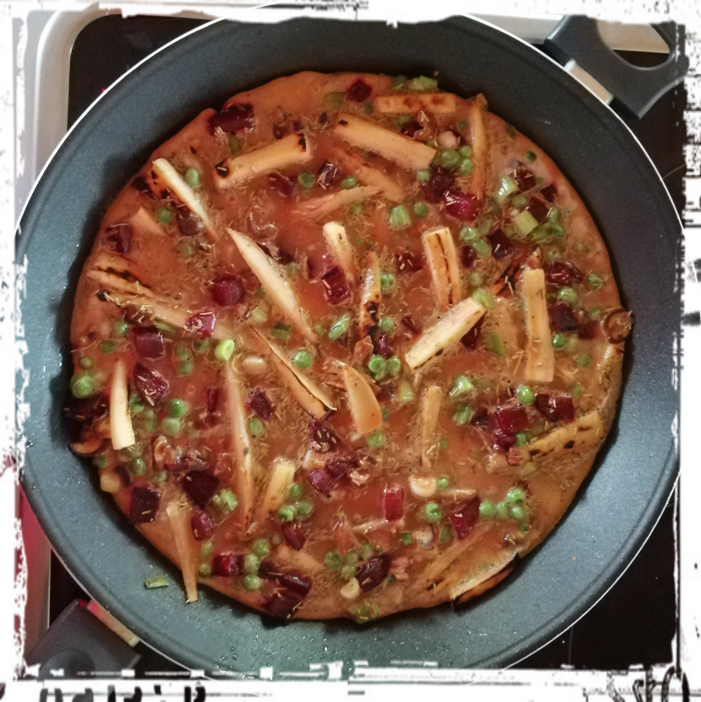 2 EL Wasser dem Schneebesen miteinander verschlagen, rote Bete, Pastinaken, Erbsenmischung und die Datteln daruntermischen, alles in eine der auf mittelstarker Hitze gut vorgeheizten Pfannen auf