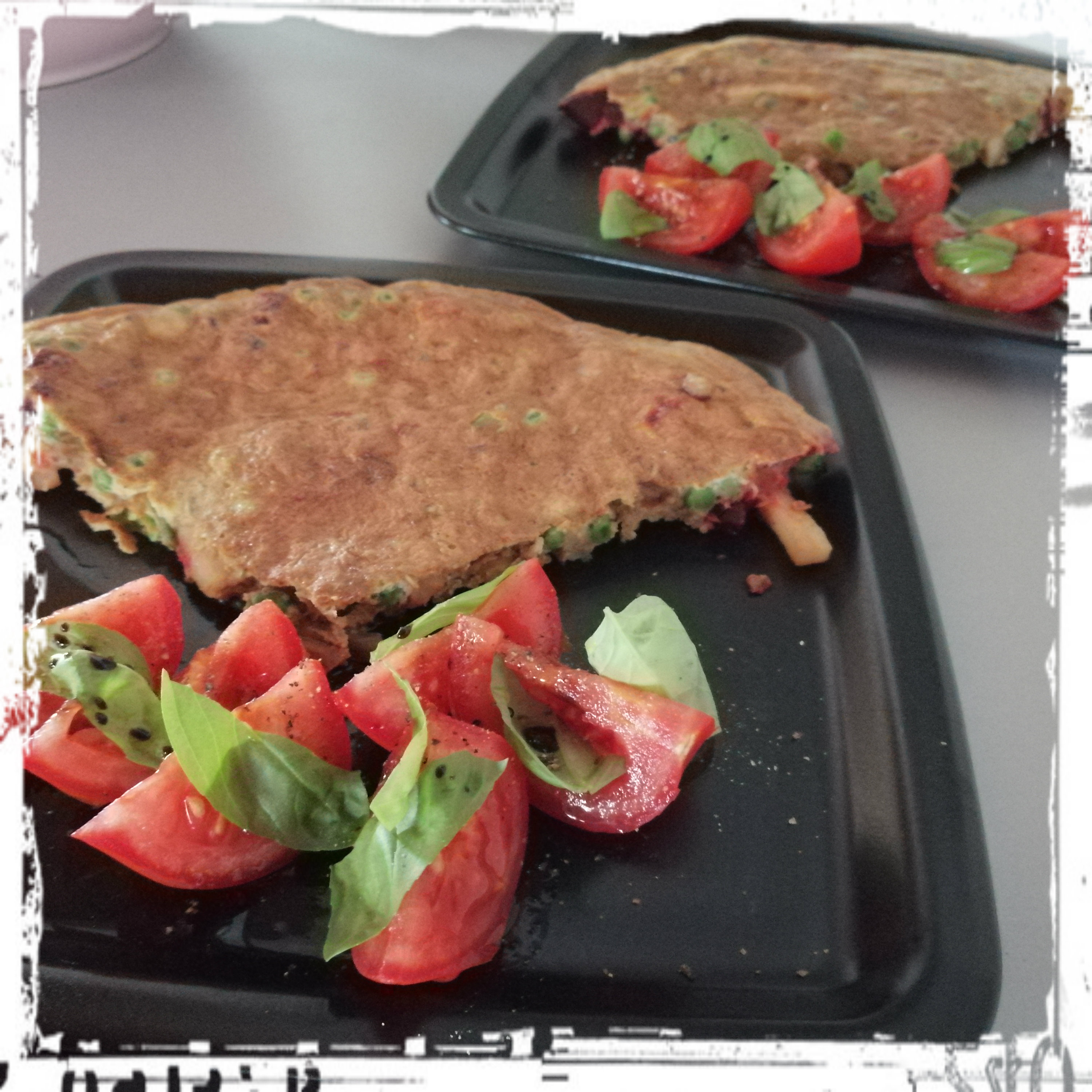 die Tortilla in zwei oder drei Stücke teilen und z. B. mit ein paar Tomaten, mit Basilikum, Olivenöl, Salz und frisch gemahlenem Pfeffer angerichtet servieren