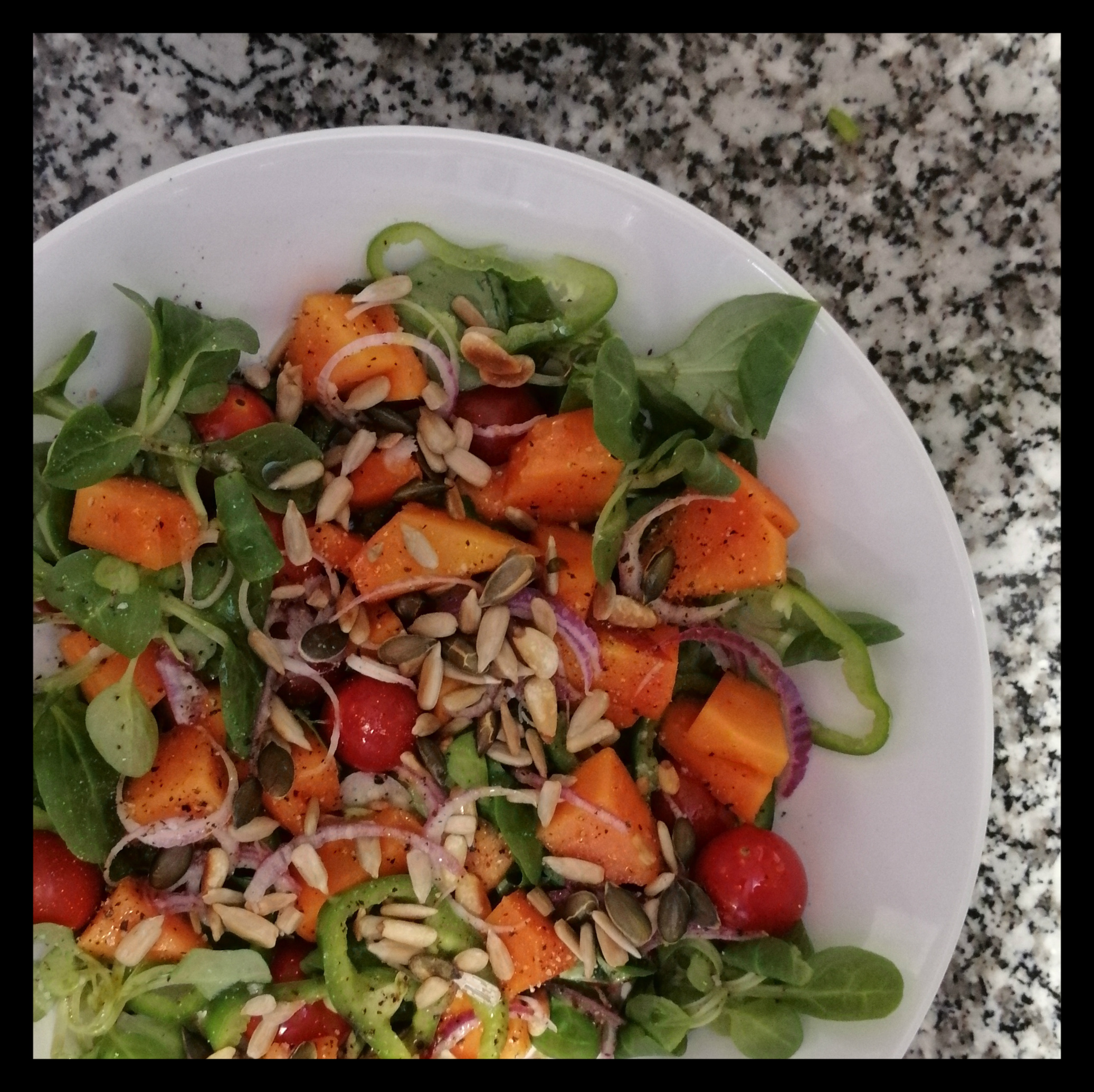 1 Scheibe Papaya (ca. 100 g) (in kleine Stücke geschnitten) zu einem Salat mischen und mit einem Dressing aus