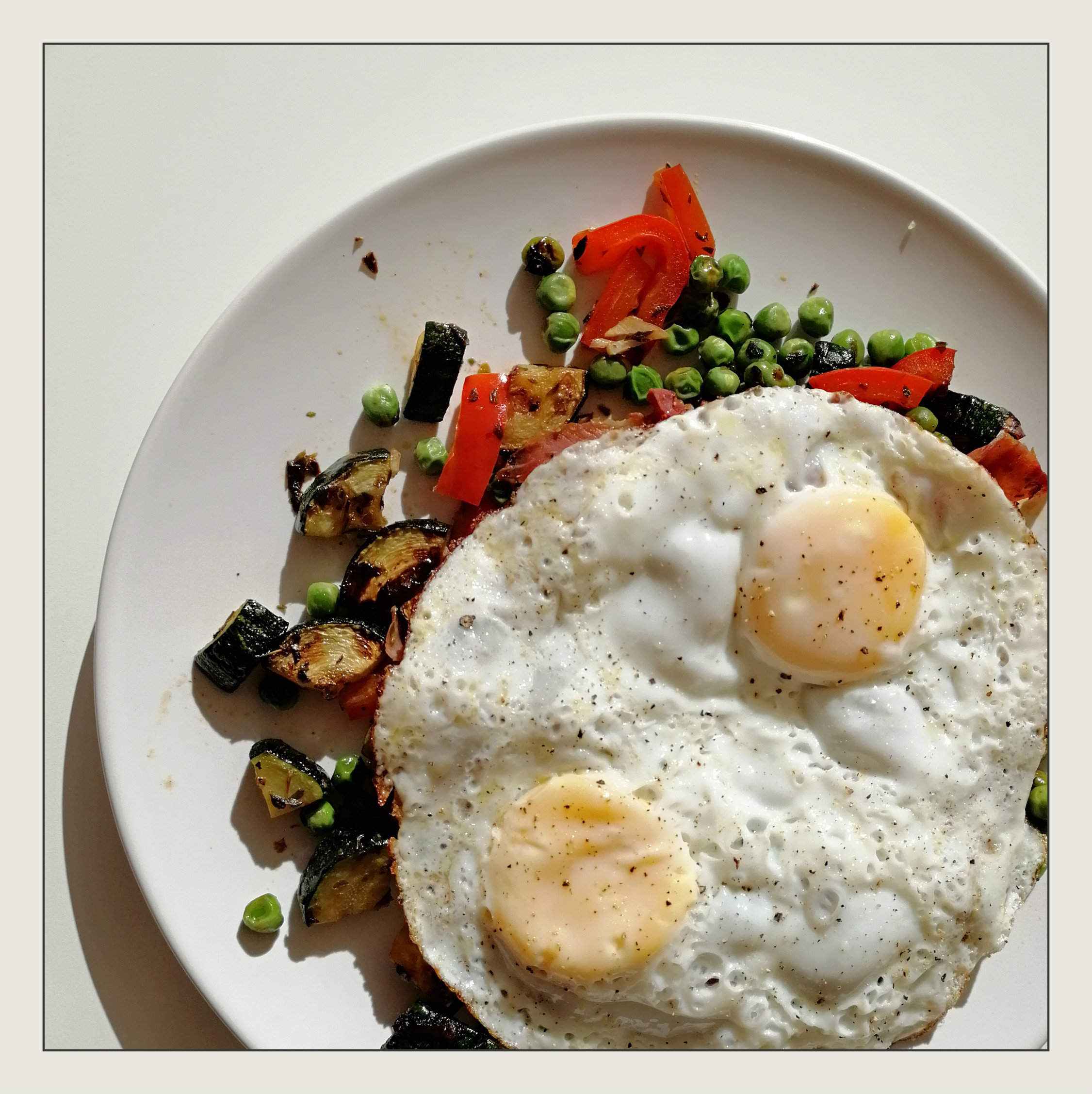 das Gemüse auf einen vorgewärmten Teller geben und die Spiegeleier darauf gleiten lassen