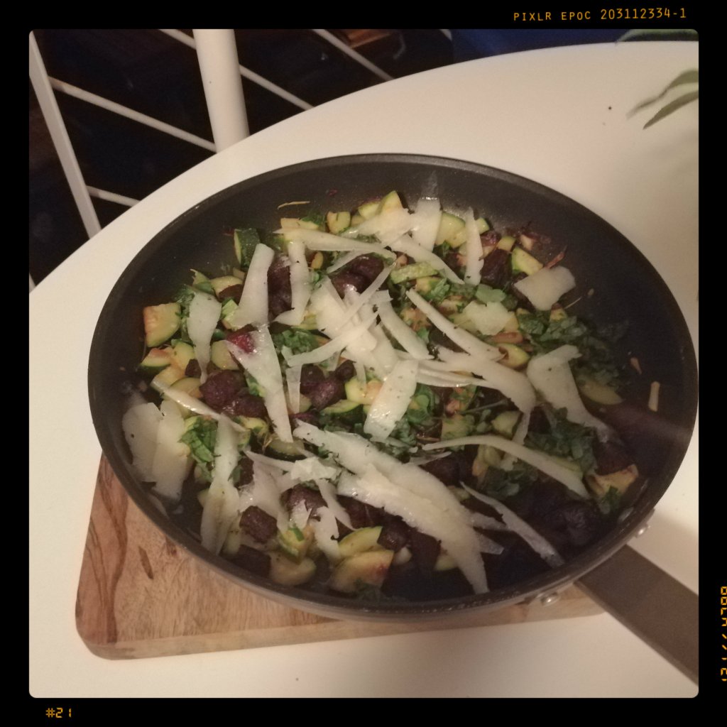 zum Schluss die roten Bete zu Zucchini und Calabacin in die Pfanne geben, alles mit der Petersilie bestreuen und den Käse darauf verteilen