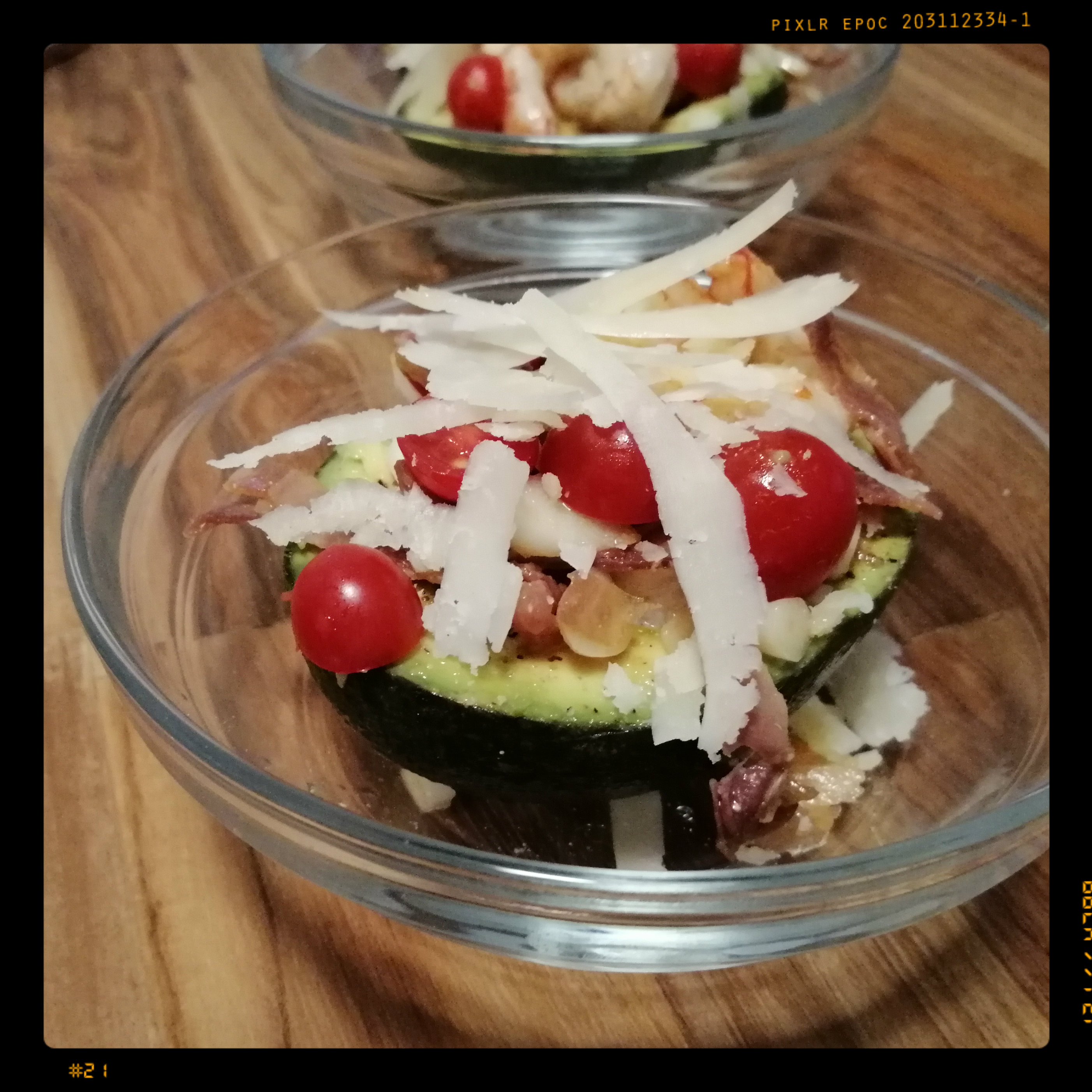 alles auf den Avocado-Hälften verteilen, dann die Tomaten und den Käse darüber geben