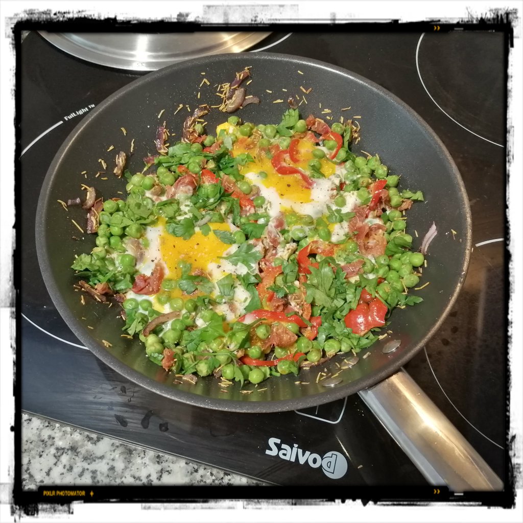frisch gemahlenem schwarzen Pfeffer würzen und die Pfanne sofort mit dem Deckel schließen, auf mittlere Hitze herunterschalten und ein paar Minuten garen, bis die Eier gestockt sind, zum Schluss mit der Petersilie bestreuen