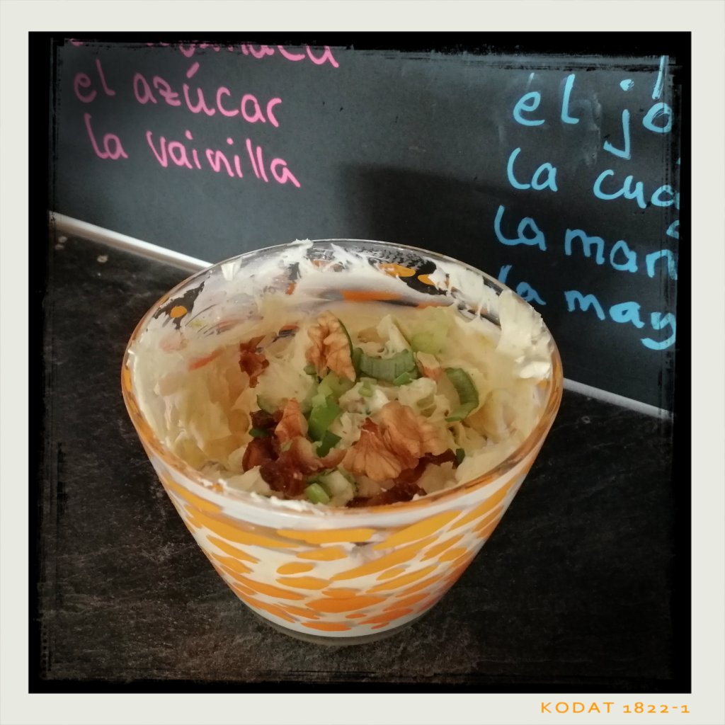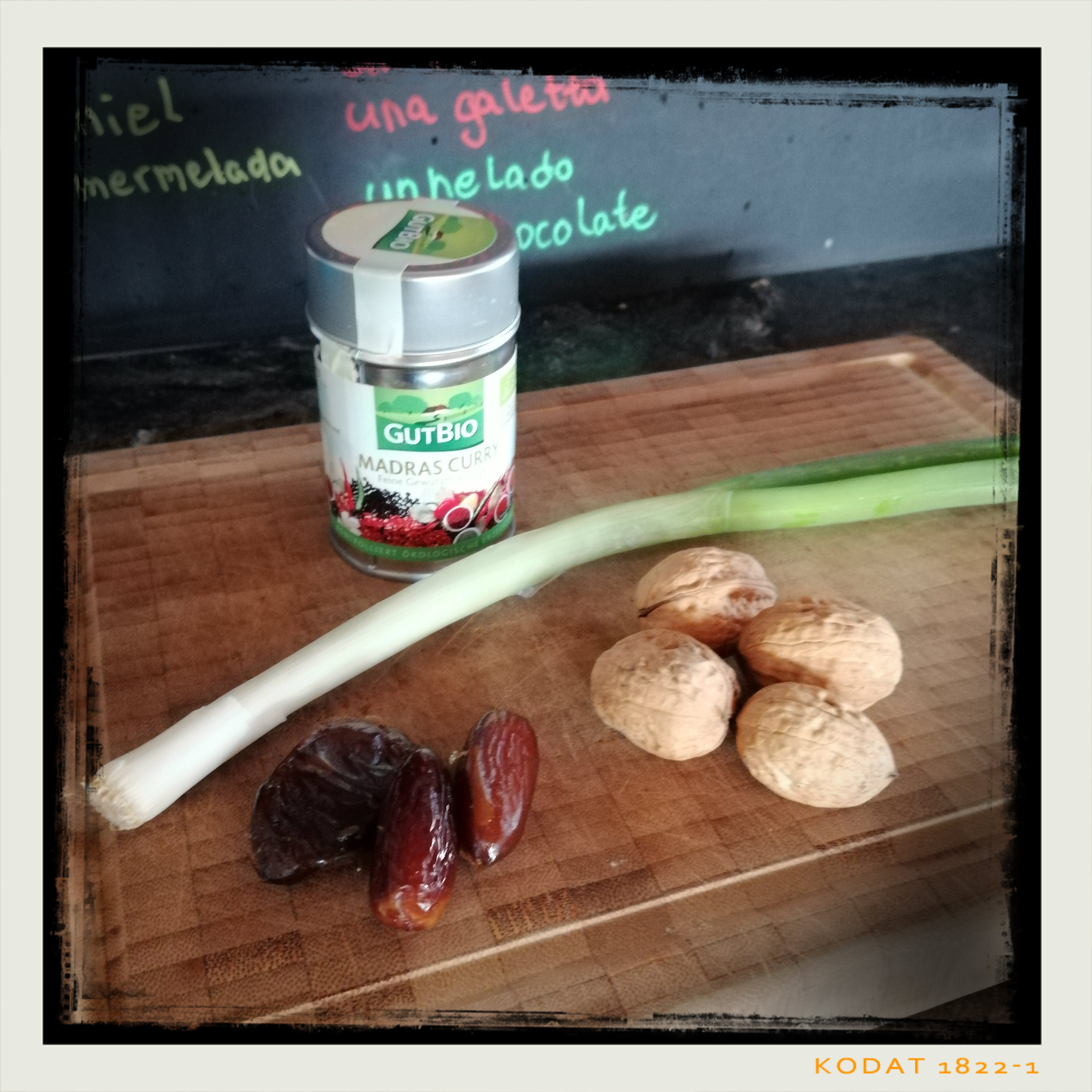 1 TL Currypulver verrühren, Datteln, Nüsse und Frühlingswiebeln untermischen und alles mit