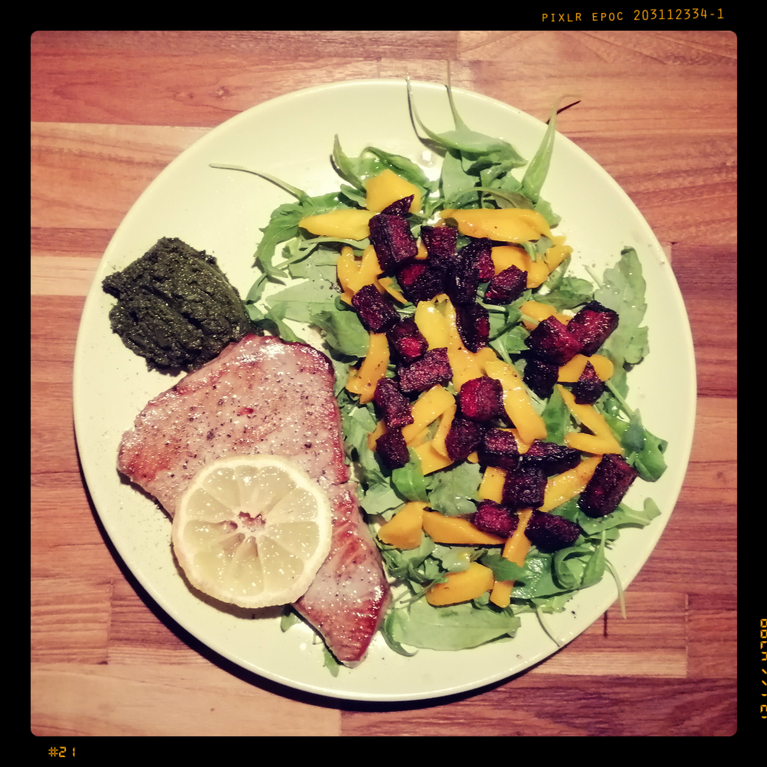 die roten Bete auf den Salat geben und das Tunfischsteak mit der Zitronenscheibe dazu legen, mit