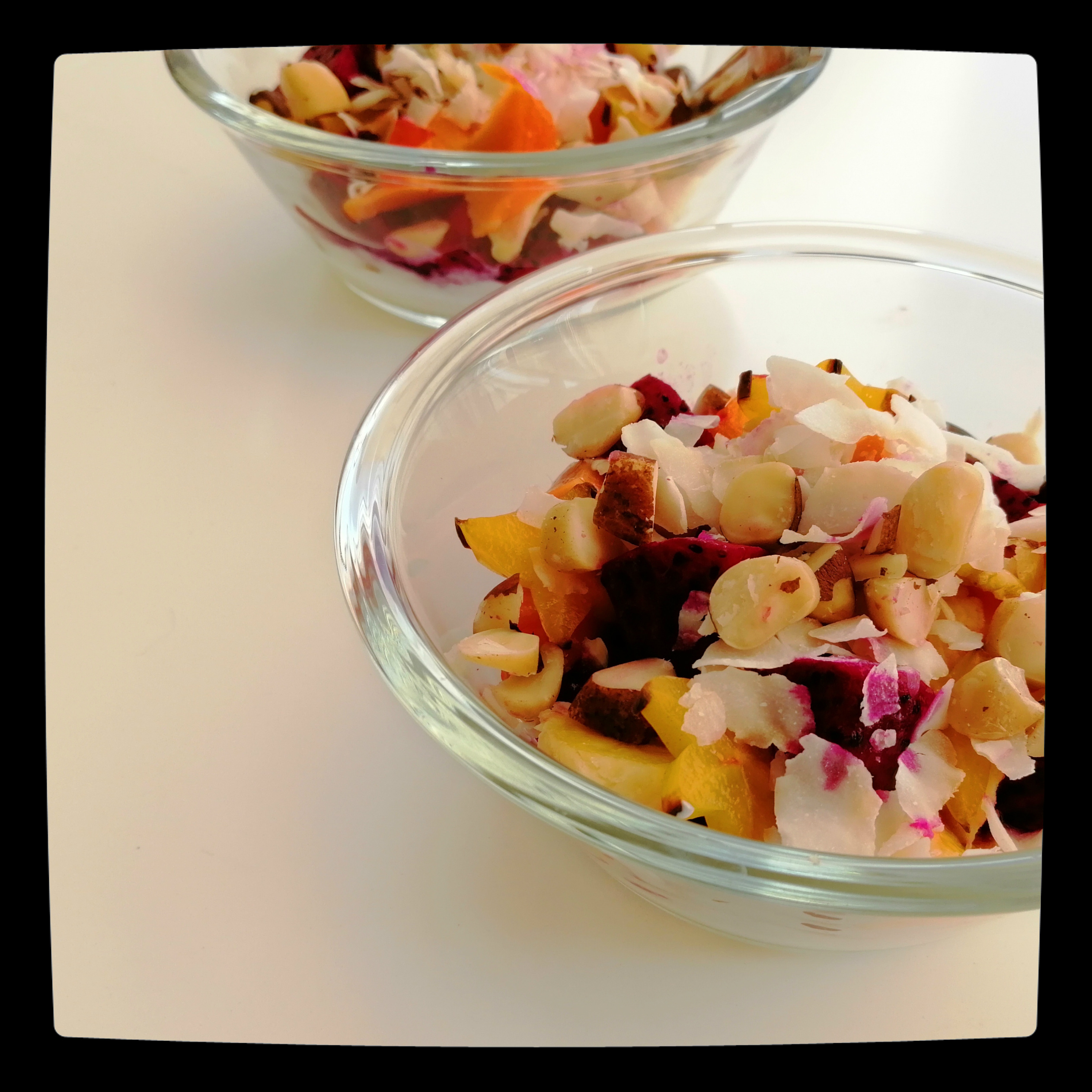 das Obst auf die Joghurts geben und alles mit