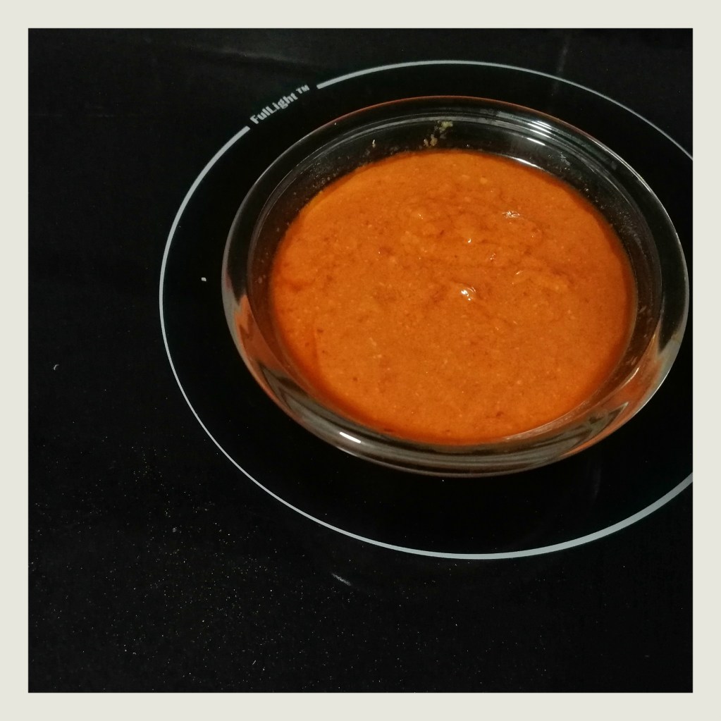 25 g roter Paprika (gewürfelt) zur Gewürzmischung geben, alles mit dem Mixstab zerkleinern, dann nach und nach