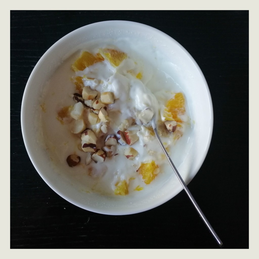 2 kl. kanarische Orangen (o. andere, ggf. 1 große) in kleine Stücke schneiden (das ist besser als filetieren, da auch die Häutchen viele gute Pflanzenstoffe beinhalten) leicht untermischen und alles mit