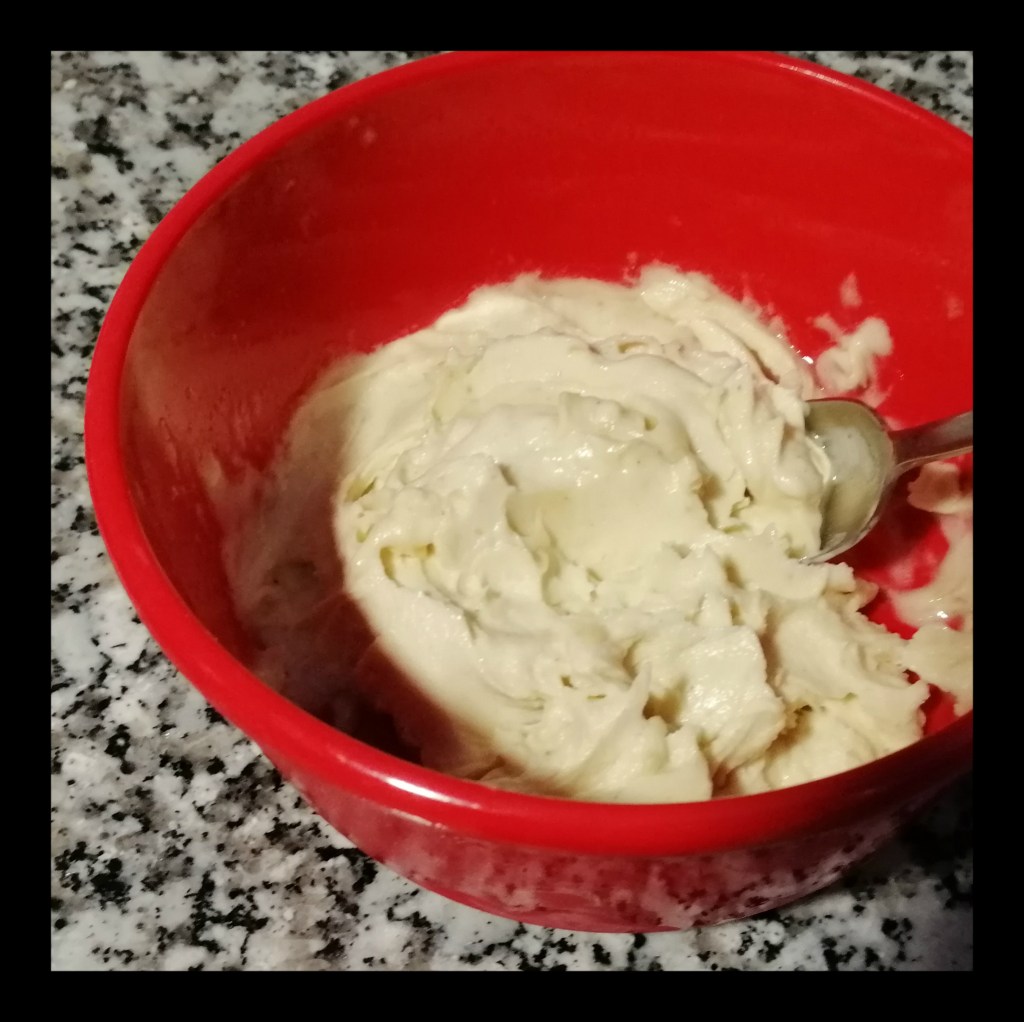 Die tiefgefrorenen Bananenscheiben mit dem Mixstab bearbeiten, bis eine cremige Masse entsteht,