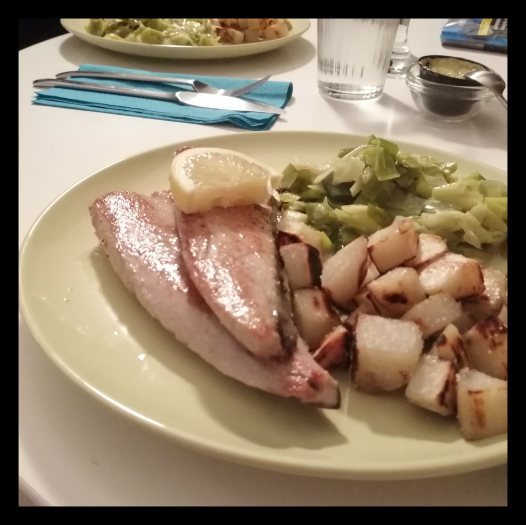 die Bonitofilets auf zwei vorgewärmten Tellern anrichten, mit der Zitrone, den Süßkartoffeln und dem Lauch servieren