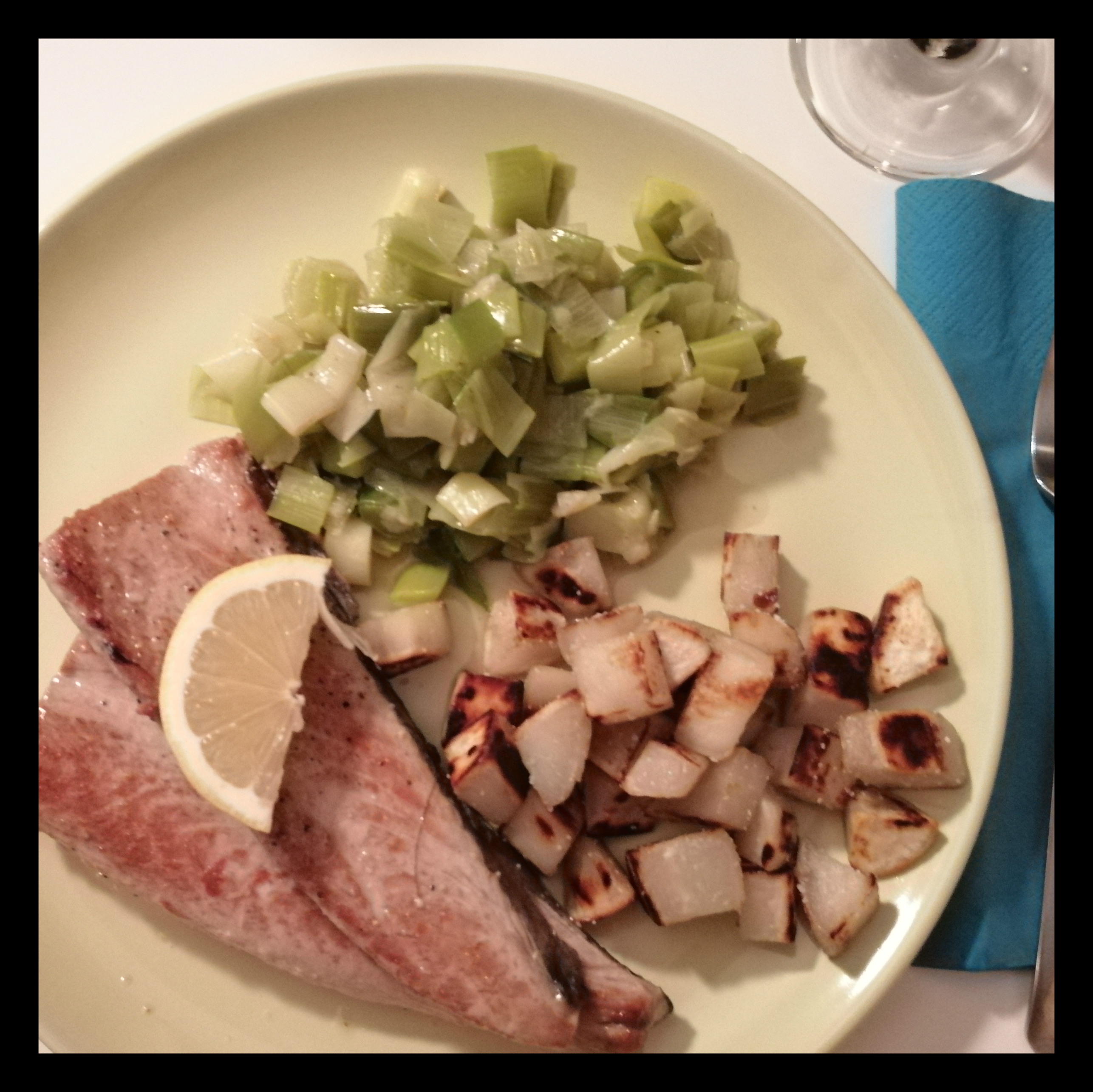 die Bonitofilets auf zwei vorgewärmten Tellern anrichten, mit der Zitrone, den Süßkartoffeln und dem Lauch servieren