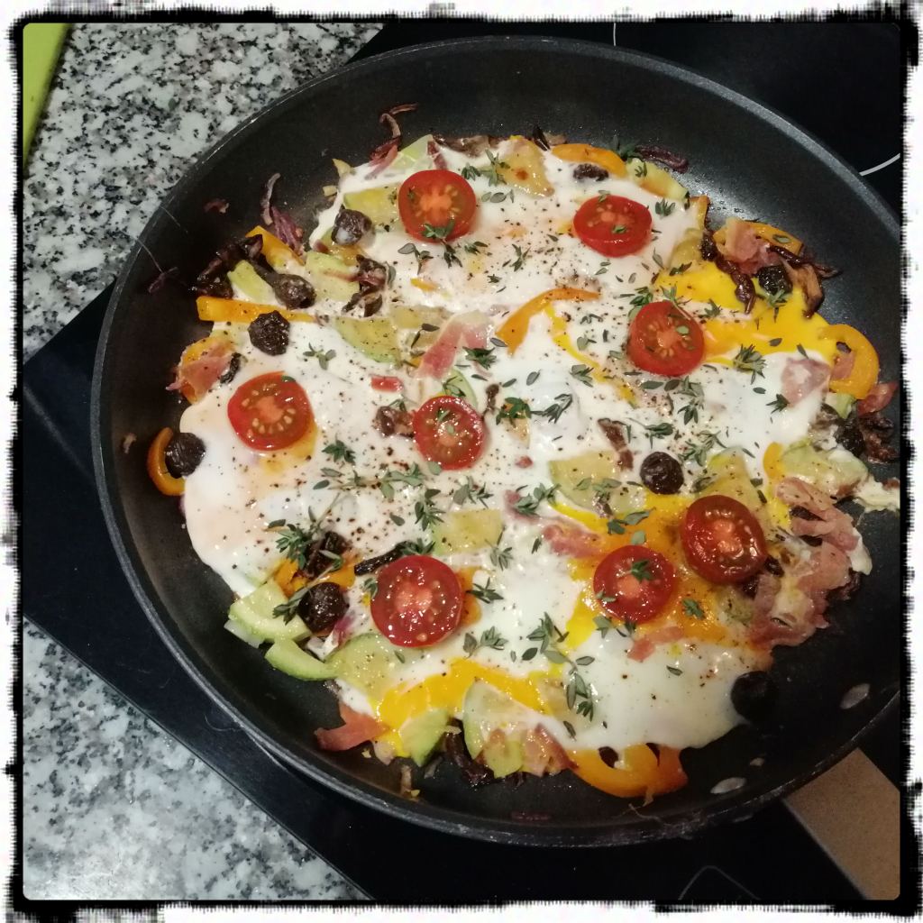 6 trocken eingelegte schwarze Oliven und die Tomaten auf den Eiern verteilen, die Pfanne mit dem Deckel schließen und wenige Minuten garen, bis die Eier gerade gestockt sind,