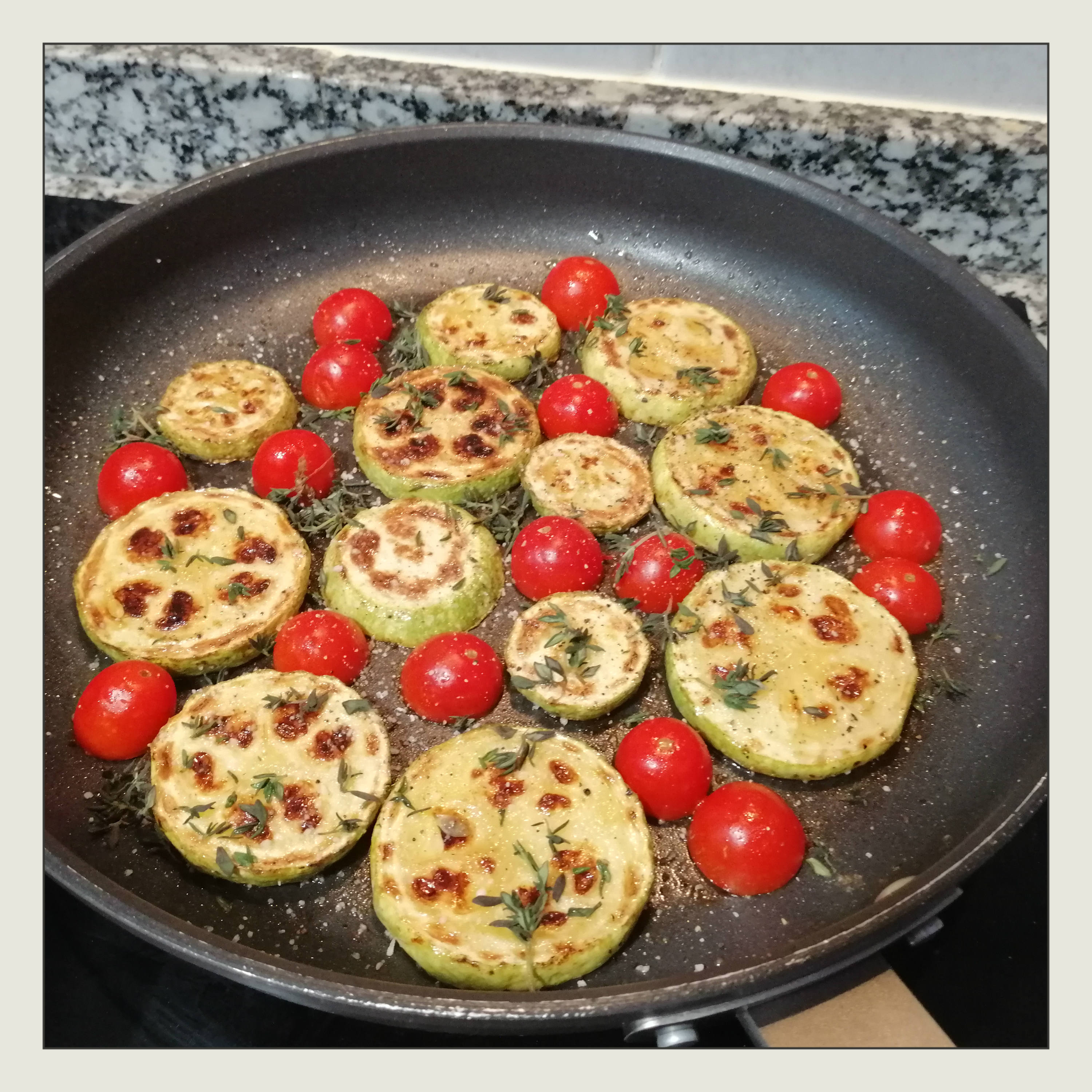 8 Datteltomaten quer halbieren, dann die Calabacin-Scheiben wenden und die Tomaten mit der Schnittfläche nach unten mit in die Pfanne geben, alles mit