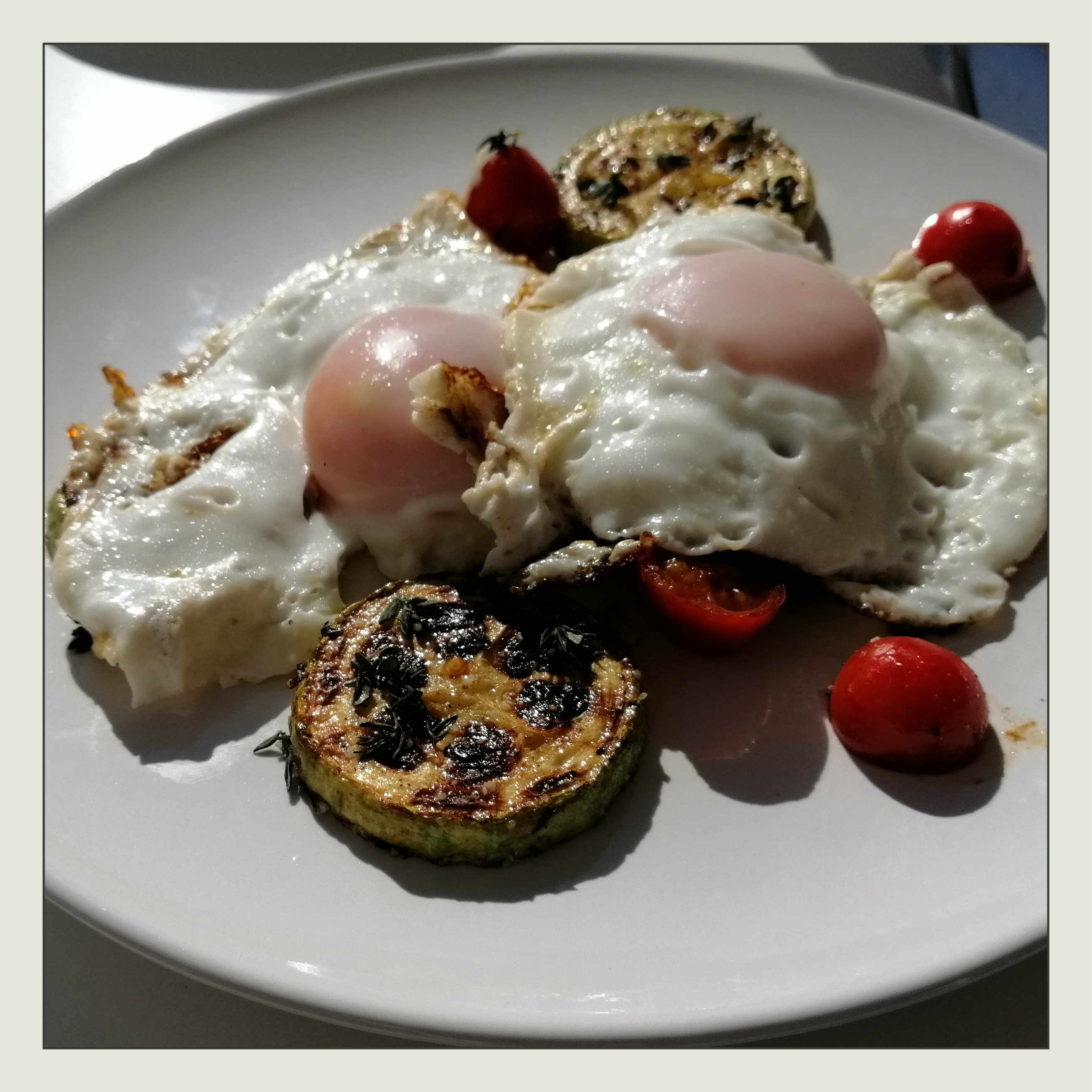 den Thymian auf dem Gemüse verteilen und das Gemüse auf zwei vorgewärmte Teller geben, dann die Spiegeleier auf das Gemüse setzen