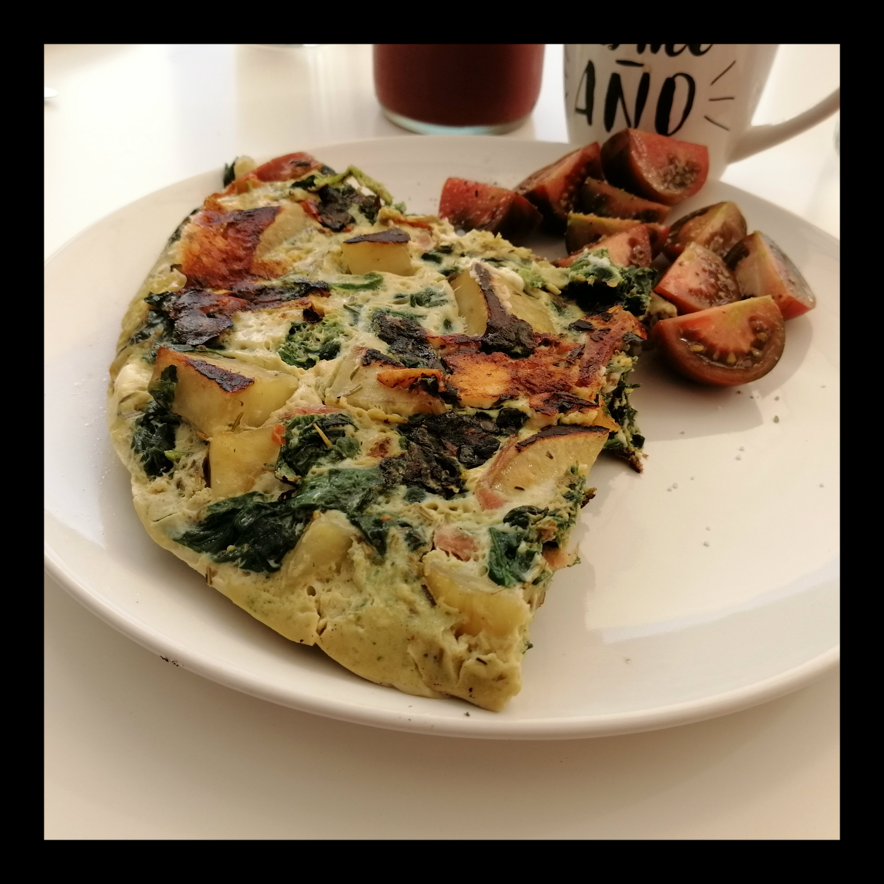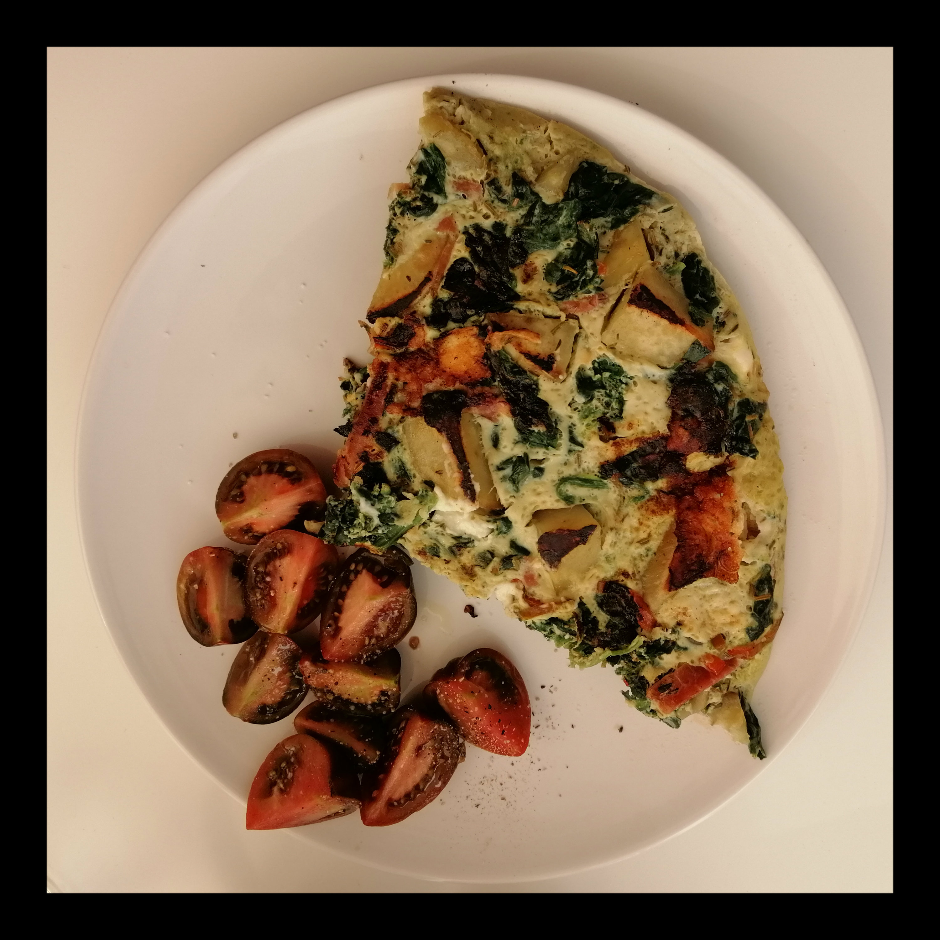 1 EL Bratolivenöl in der Pfanne mittelstark erhitzen, die Ei-Mischung hineingeben und die Pfanne sofort mit dem Deckel schließen, nach 4 Min. die Hitze auf mittelschwach reduzieren, etwa weitere 6 – 8 Min. (je nach Pfannengröße) garen, bis auch die Oberfläche gestockt ist, dann die Tortilla mit