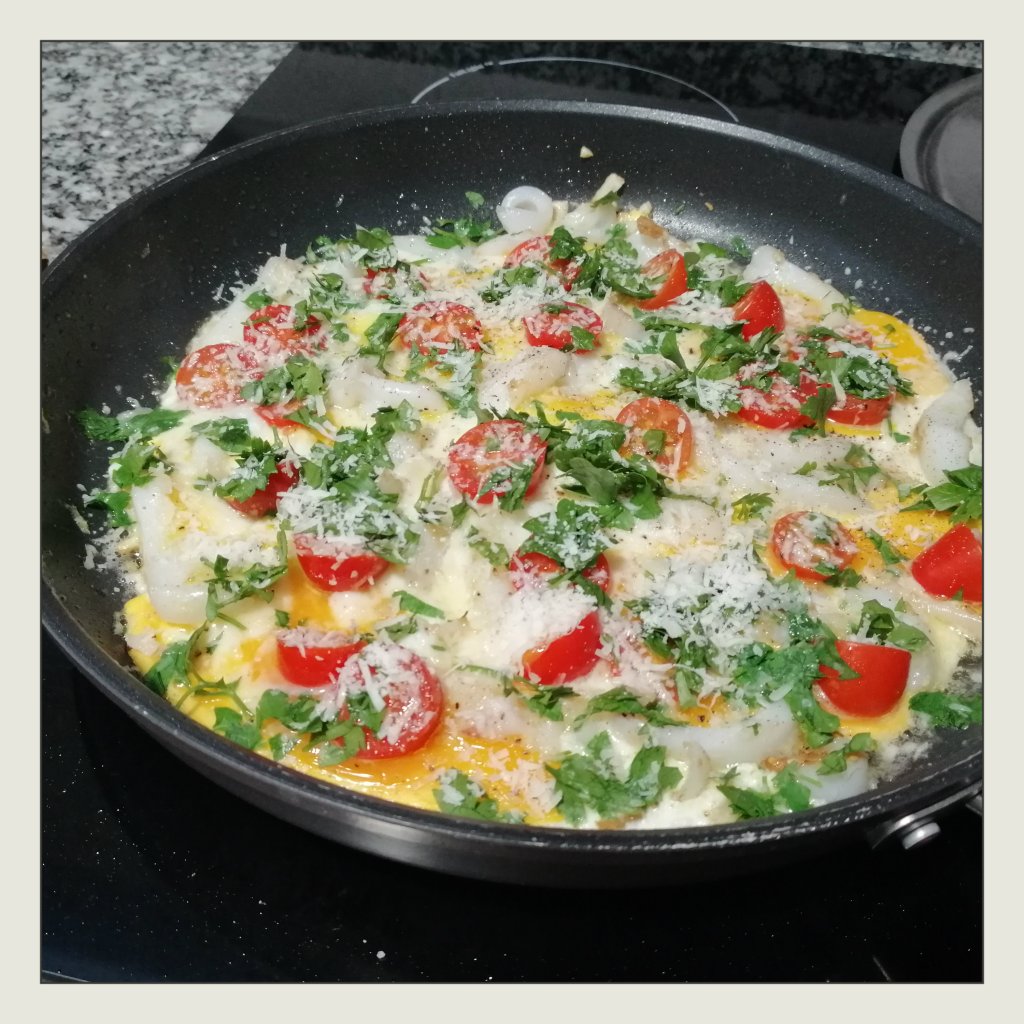 frisch gemahlenem schwarzen Pfeffer würzen, die Pfanne mit dem Deckel schließen und alles wenige Minuten erhitzen, bis die Eier gerade gestockt sind, anschließend alles mit der Petersilie und dem Käse bestreuen, die Eier zerteilen und auf zwei vorgewärmten Tellern servieren