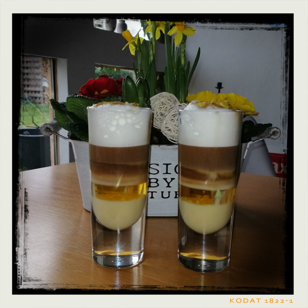 1 Café solo (Espresso) direkt aus der Maschine durch den Milchschaum in das Glas laufen lassen (je cremiger der Espresso aus der Maschine kommt, um so weniger mischen sich die einzelnen Komponenten), zum Schluss