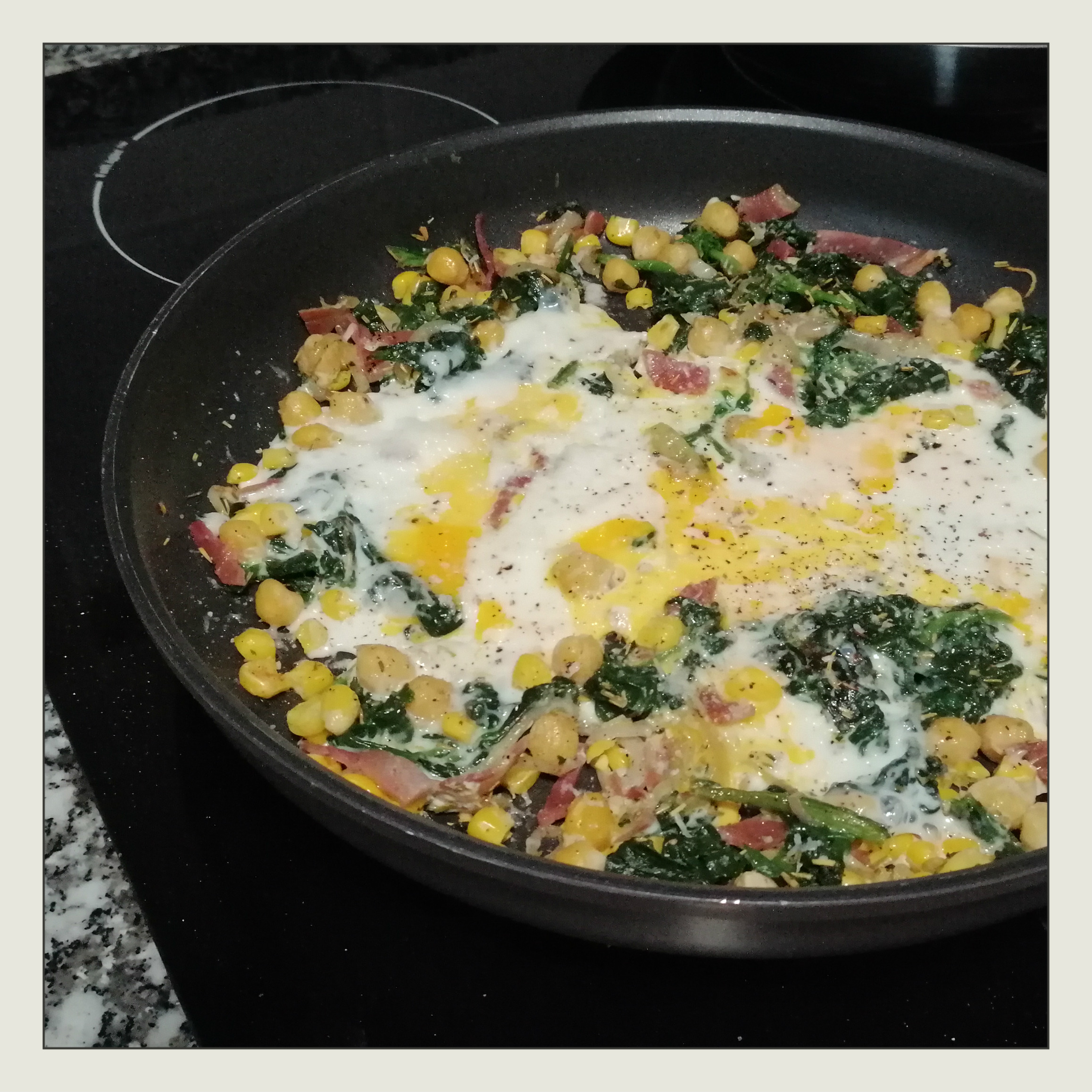 2 Eier (L) aus größerer Höhe auf die Gemüsemischung klatschen lassen, die Pfanne mit dem Deckel schließen und die Eier in ca. 3 Min. stocken lassen, dann noch etwas