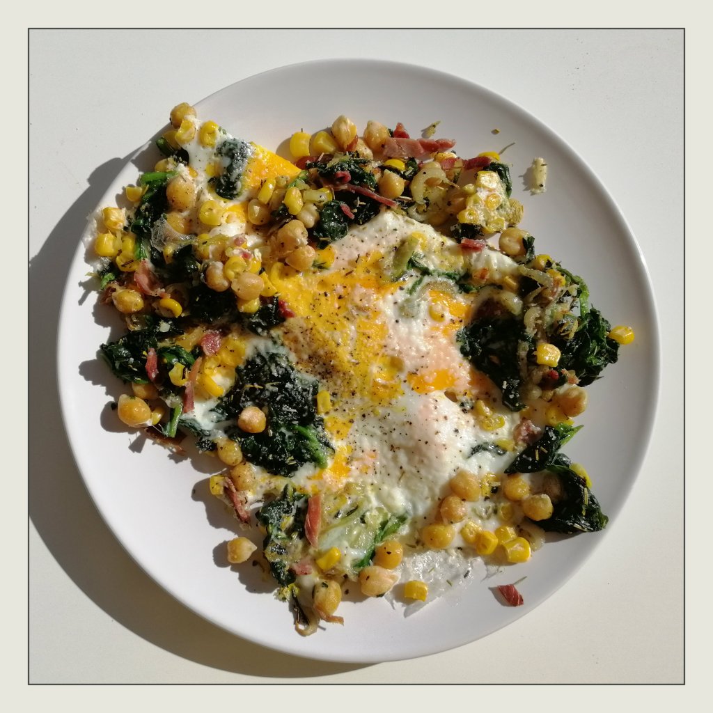 1 EL Brat-Olivenöl bei mittlerer Hitze in einer Deckel-Pfanne ca. 3 Min. dünsten, dann Spinat, Mais, Knoblauch und
